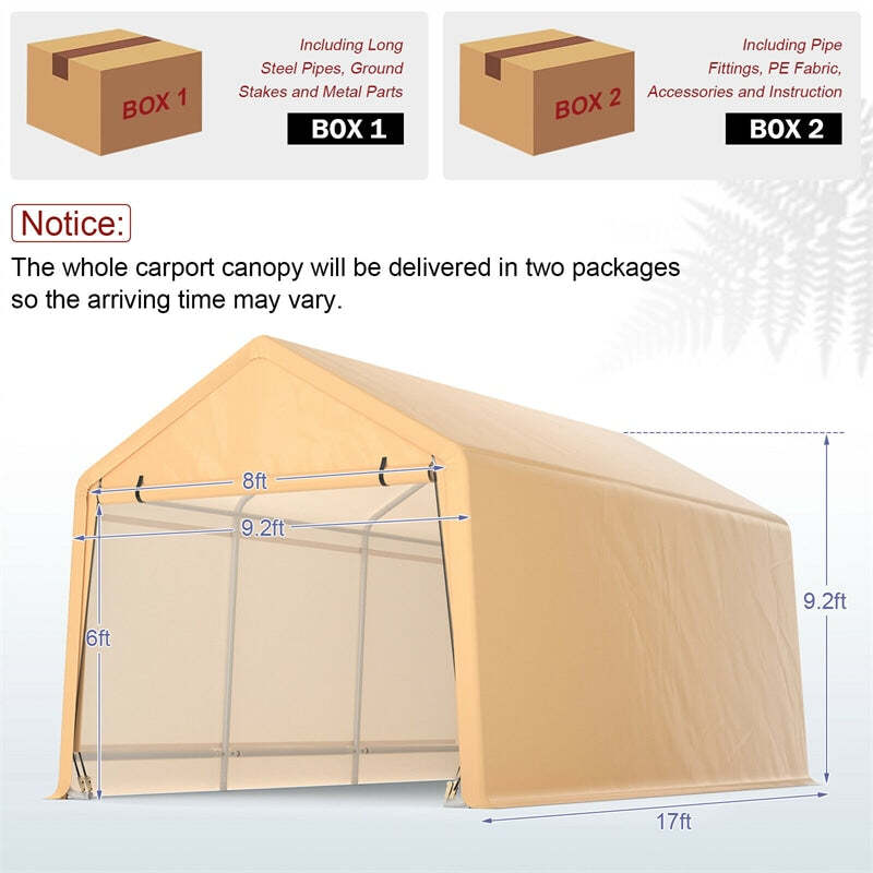 - Simple Assembly Required: The carport needs to be assembled, but it won't be that difficult because easy-to-follow instructions will be included for you. And one thing that should be mentioned is that the carport will be shipped in two boxes so the delivery time may be different. Please wait for them with patience.