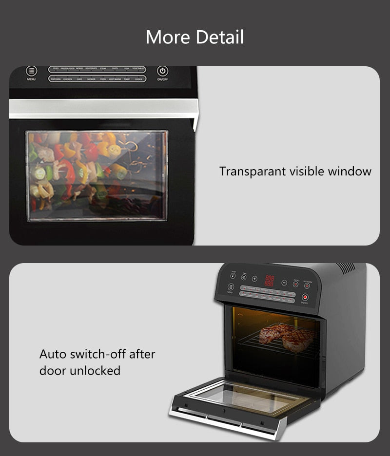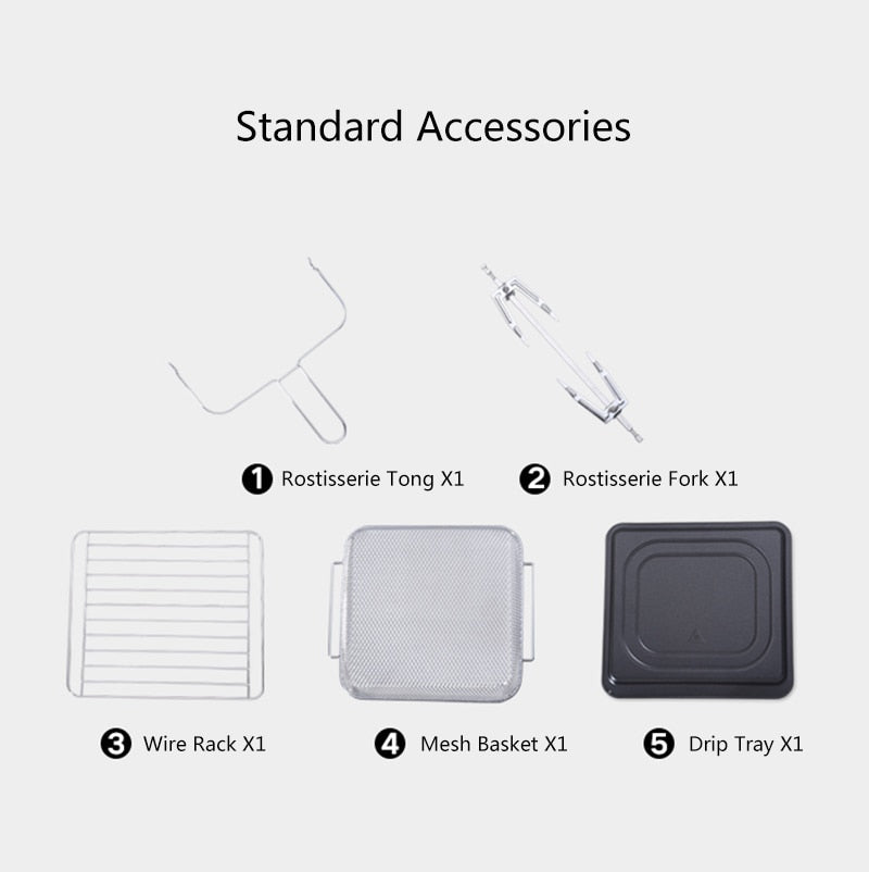 (2 as optional) to maximize your cooking potential. Air Fry, roast, rotisserie, bake, dehydrate,etc! You’ll easily cook the taste of delicious,