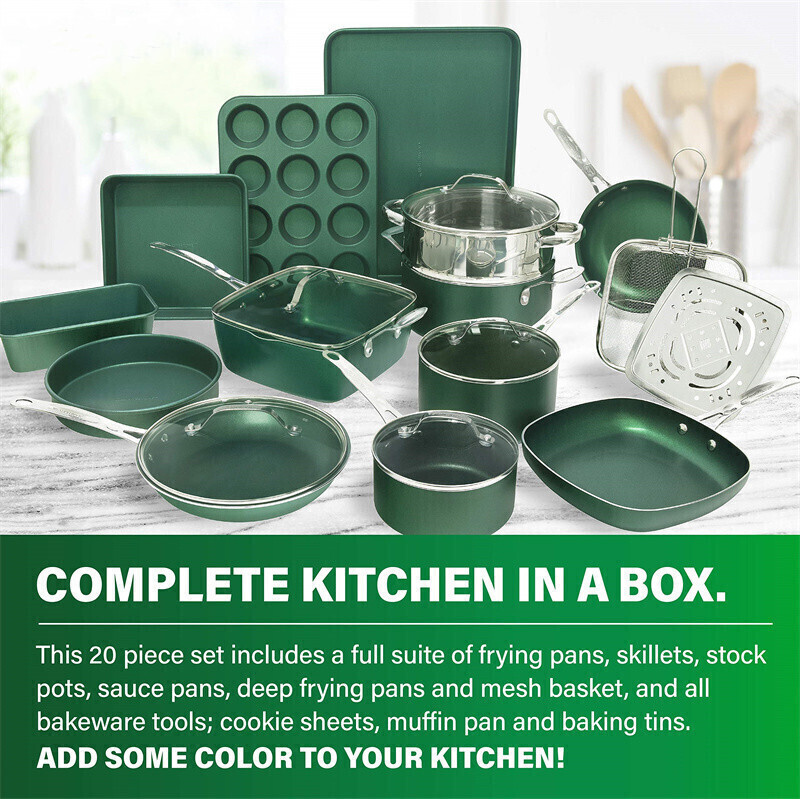 - COMPLETE KITCHEN IN ONE BOX - includes everything you need to fully outfit your kitchen and take cooking , including a complete cookware set with frying pans, skillets, saucepans, soup pots with tempered glass lids, a frying and casserole pan with steamer insert, frying basket and lid, and a complete PRO baking kit with cookie sheet/jelly roll pan, loaf pan, muffin tin, square pan and more!