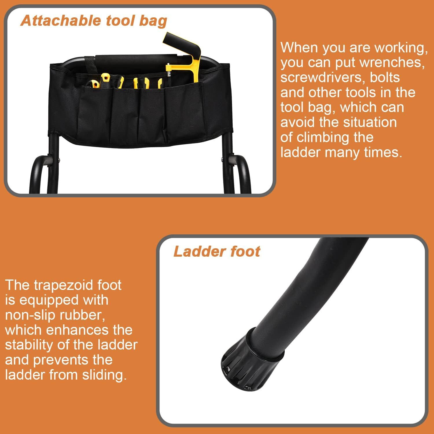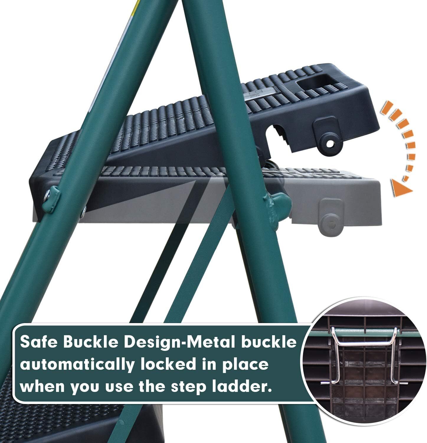 - SECURITY AND STABILITY—High-grade steel frame is constructed with strength and reliability. Metal safe buckle automatically locked in place when you use the step ladder. The back cross brace structure reinforce the basic support which will make you feel more safe climbing up the step ladder.