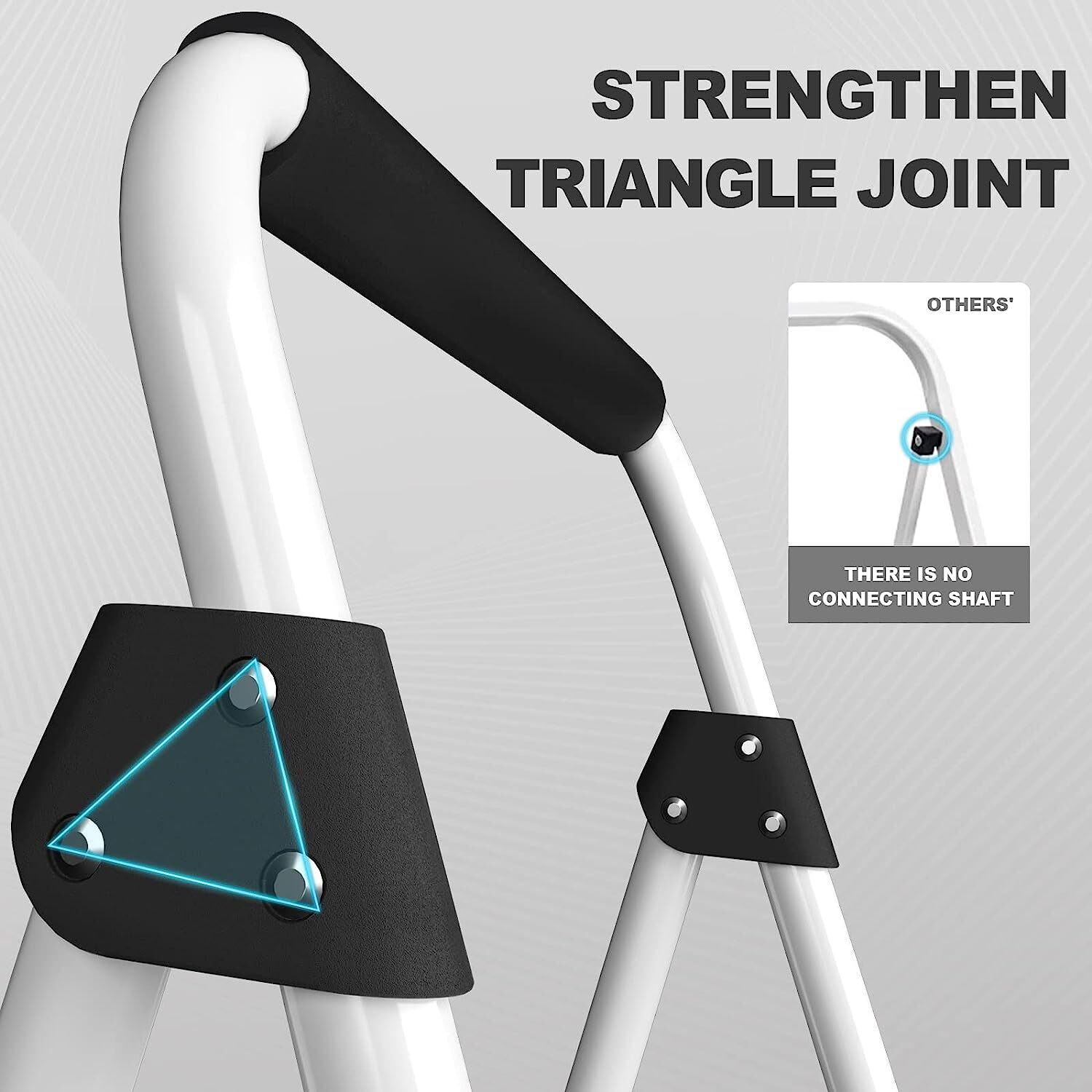 - NON-SLIP DESIGN: The 3 step ladder has non-slip rubber handgrip making the stool easy to climb and carry. Wide pedals with non-slip rubber pattern offer heel-to-toe foot support. Big rubber feet fully touch the groud to stays firmly and prevent floors from scratches. (NOTE: Improper use of rubber feet will cause the step ladder to shake left and right. Please make sure that the rubber feet are in full contact with the ground.)