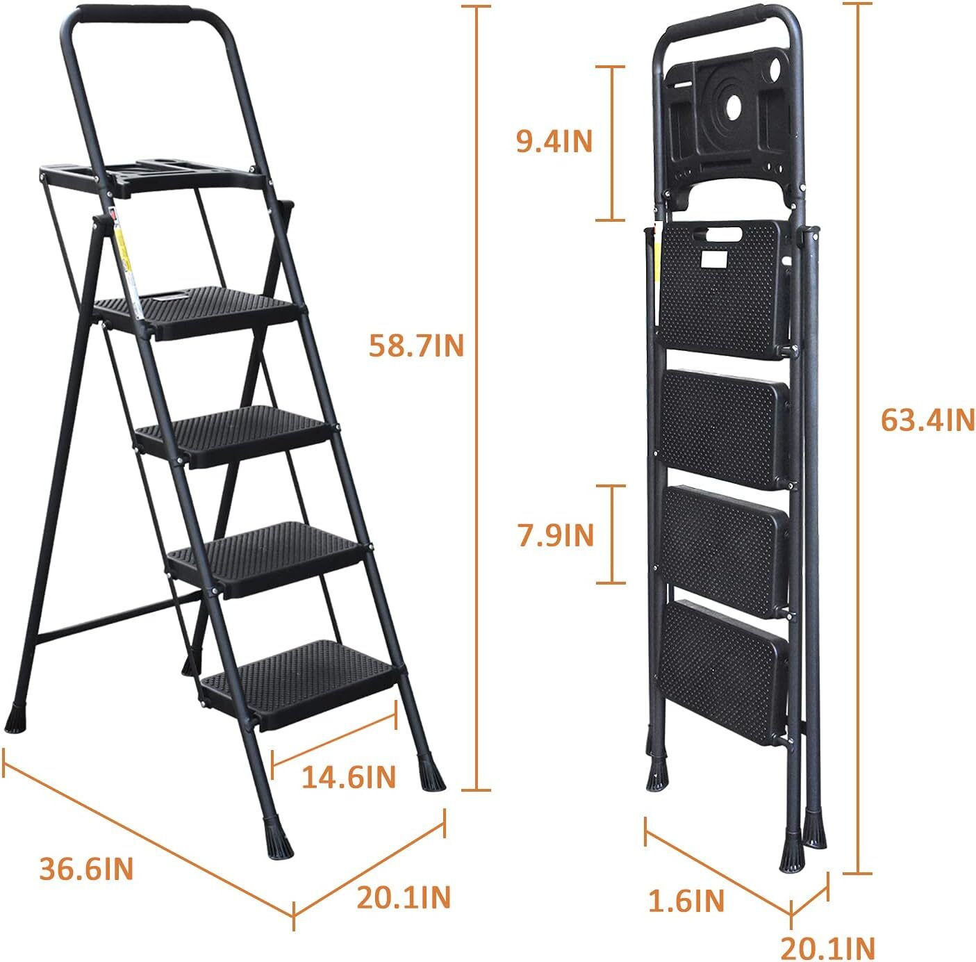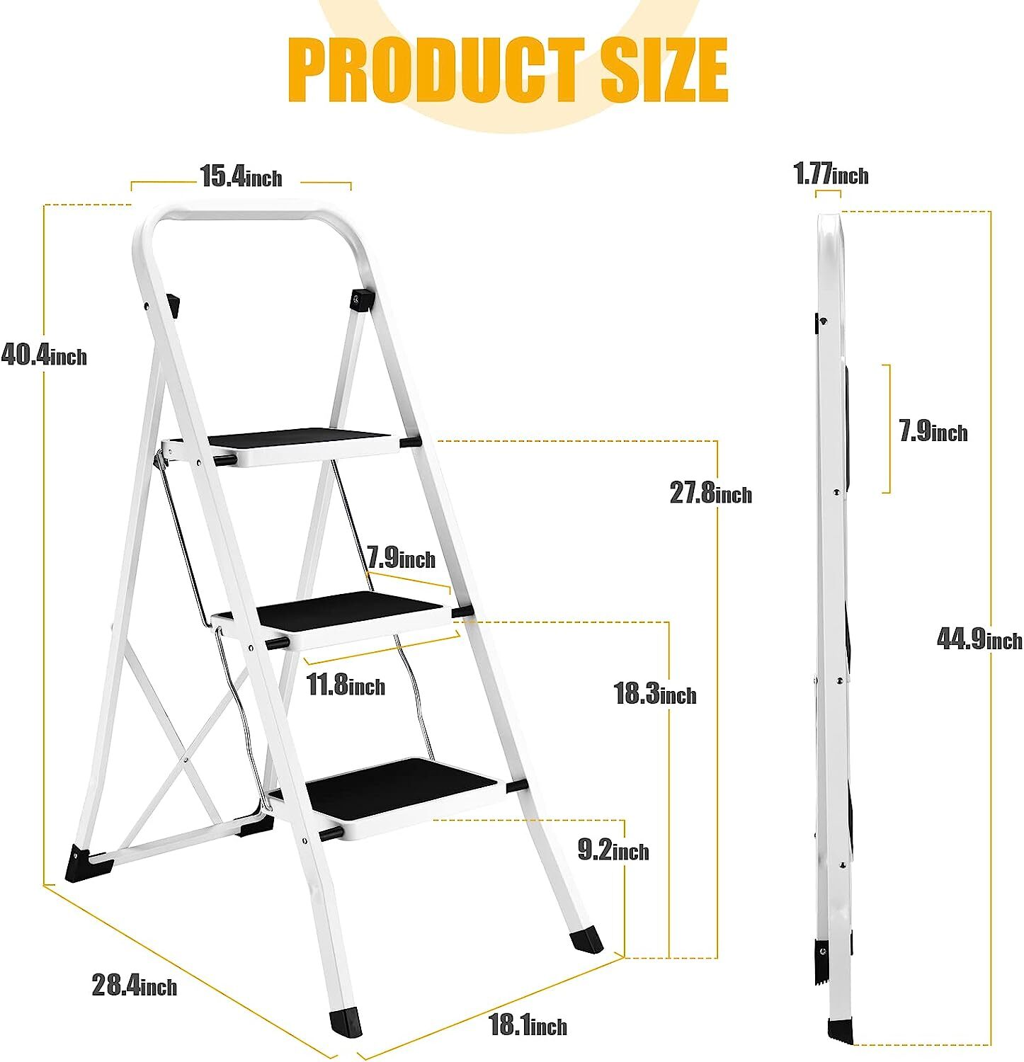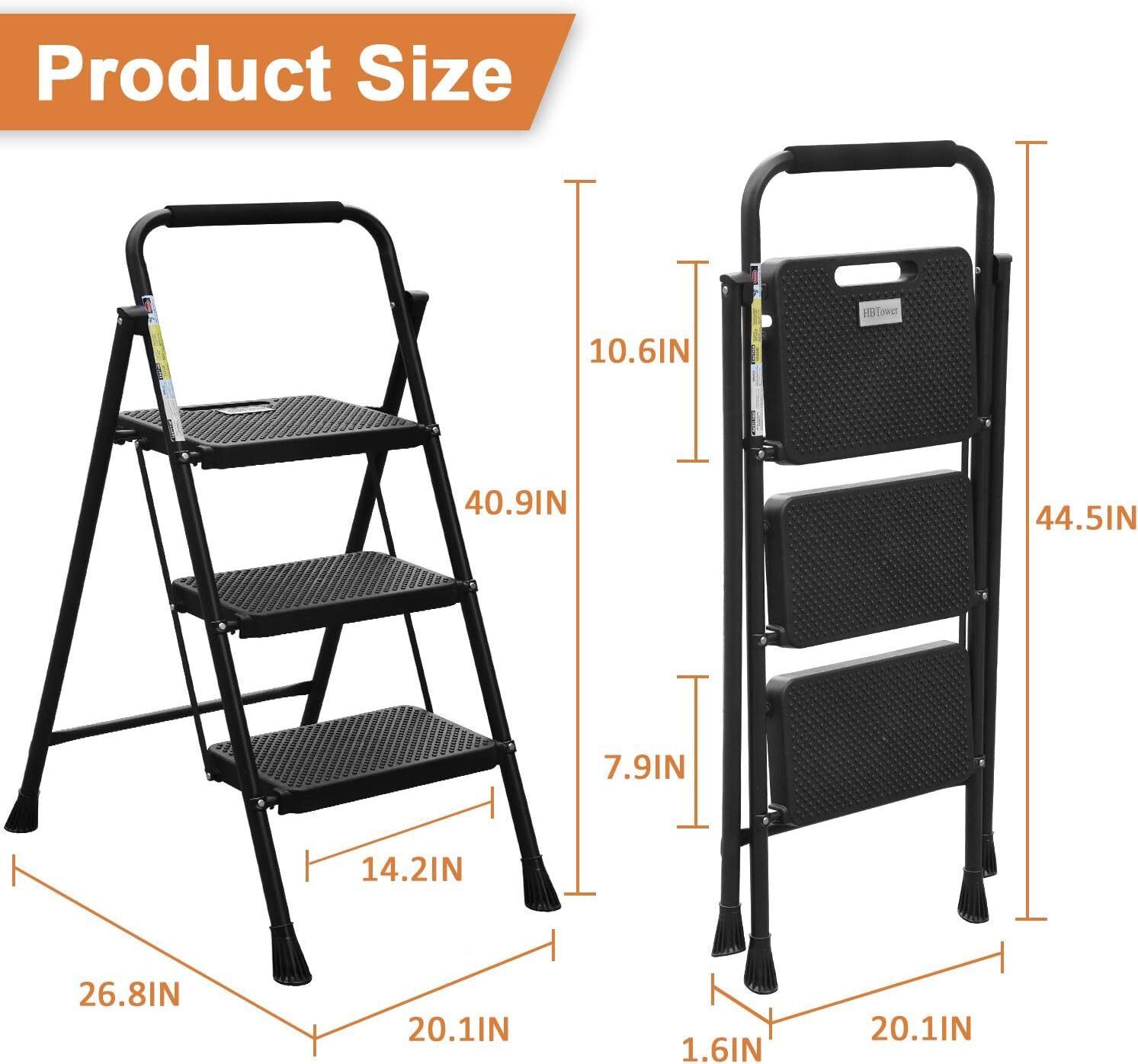 - 2023 UPGRADE STEP LADDER—Open: 20.1" x 26.8" x 40.9", Folded: 44.5" X 20.1" X 1.6", Net Weight: 11.5 pounds, Maximum Load: 500 pounds. Safety Folding 3 Step Steel Ladder is made for you!