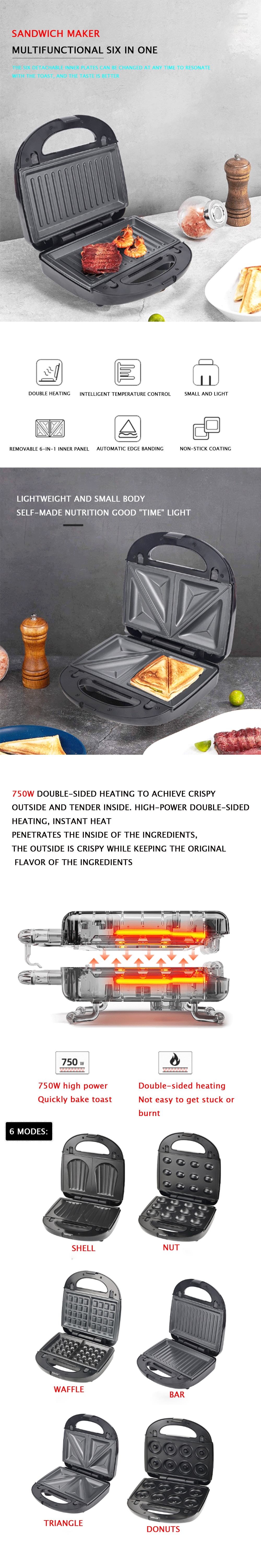 6-in-1 sandwich maker, we offer you 6 different detachable cooking plates for you to grill various delicious food.