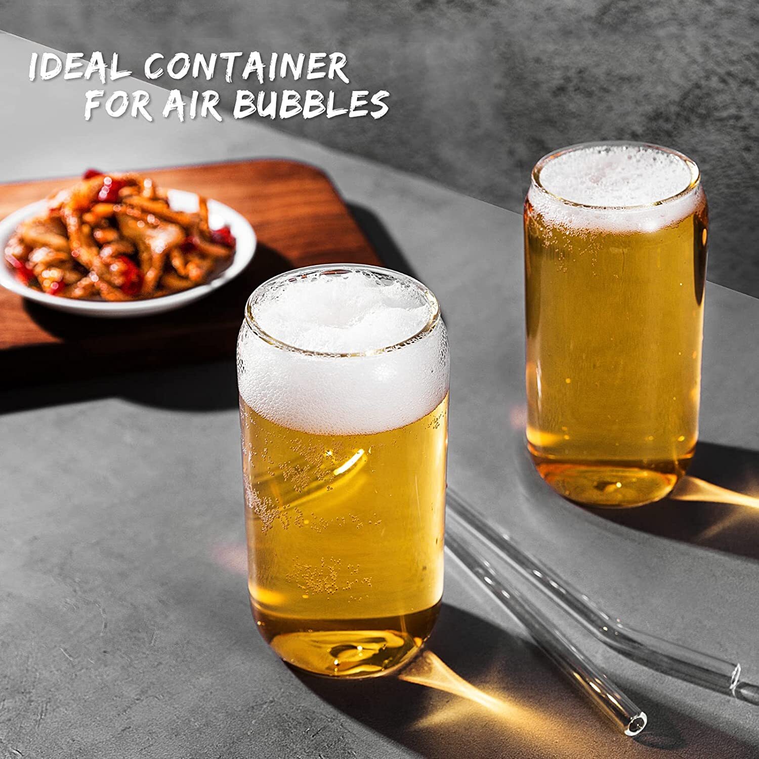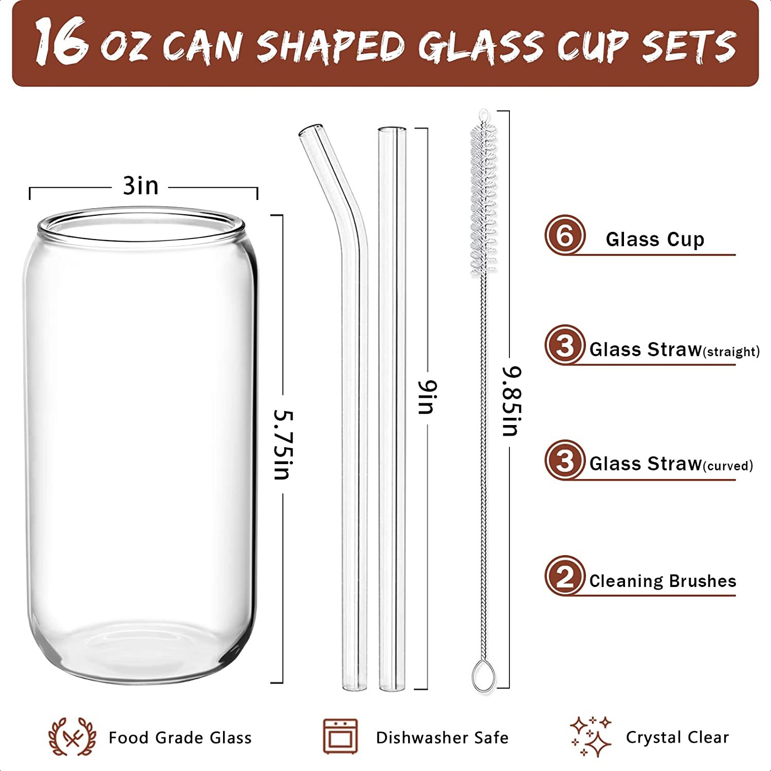 - [ENHANCED DRINKING PLEASURE] Glass cup set includes 6 can shaped glass cups, 6 bamboo lids, 6 glass straws and 2 cleaning brushes. Designed with the smooth and pleasing contours of the similar traditional aluminum can, it is definitely the ideal container for iced coffee, beer, cocktails, milk tea, soda, juice and any beverage you can think of.