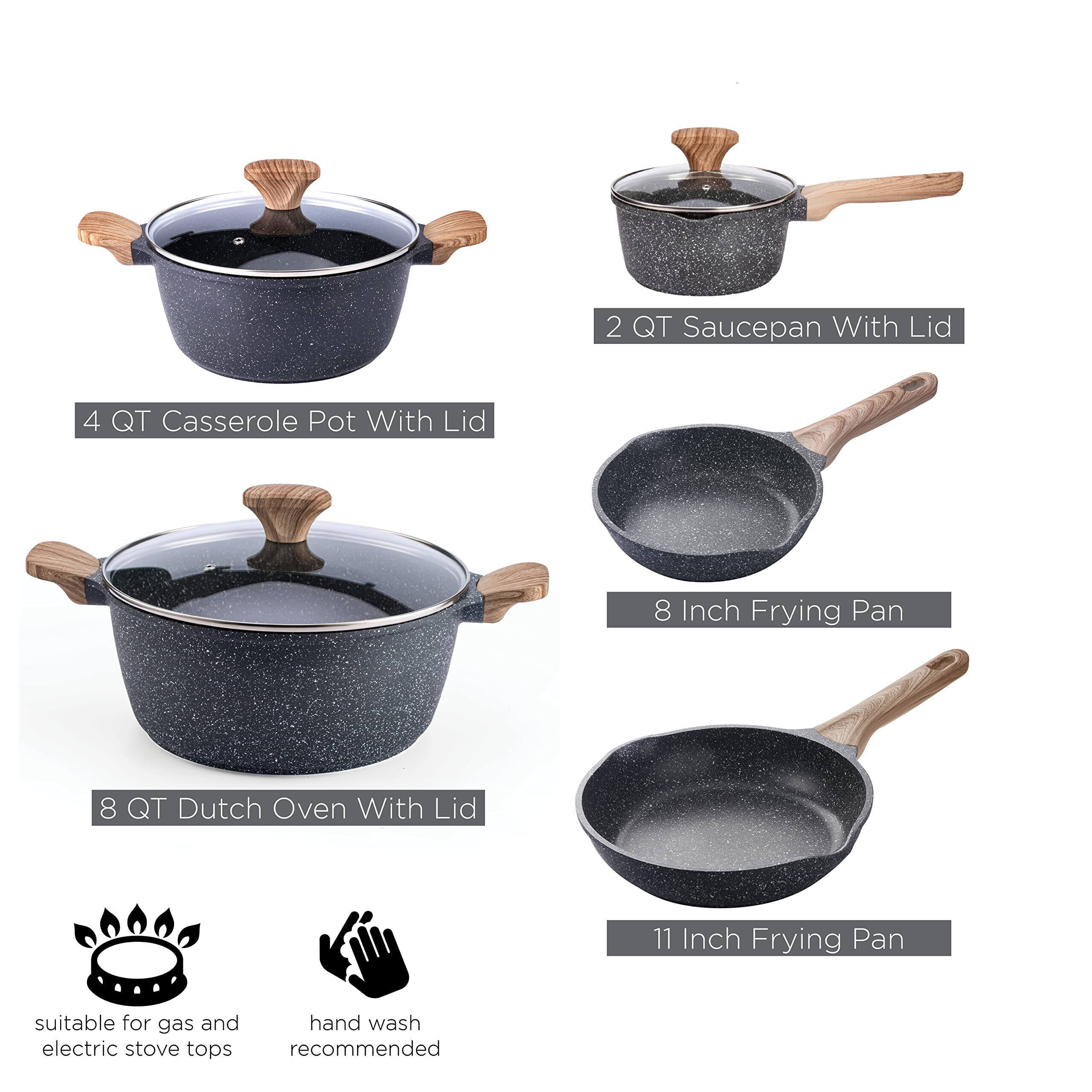 SET INCLUDES - A complete kitchen essentials set, you're getting a total of 8 pieces. Including an 8 qt casserole pot with glass lid, a 4 qt casserole pot with glass lid, an 11 frying pan, an 8 frying pan, and a 2 qt sauce pan with glass lid. These beautiful cookware sets are designed with a speckled coating and woodlike handle. Not only functional, but these saut¨¦ pans are decorative as well.