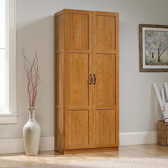 Finished in a beautiful Highland Oak and detailed with frame and panel doors and sides, this tall cabinet is ideal for the kitchen, basement, garage, utility room, or anywhere you need a storage solution. Store in style with this storage cabinet with doors from the Select collection. We hope you like what you see.