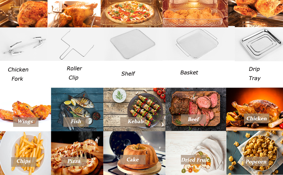 - 🍳【Easy to Clean & Customer Service】- Our air fryer oven includes cooking accessories for free: oil tray, wire rack, chicken fork, fry net basket, and baking tray. All accessories are removable for easy cleaning, nonstick, dishwasher safe. In addition, we provide you 24-hour after-sale service, please feel free to contact us when necessary.