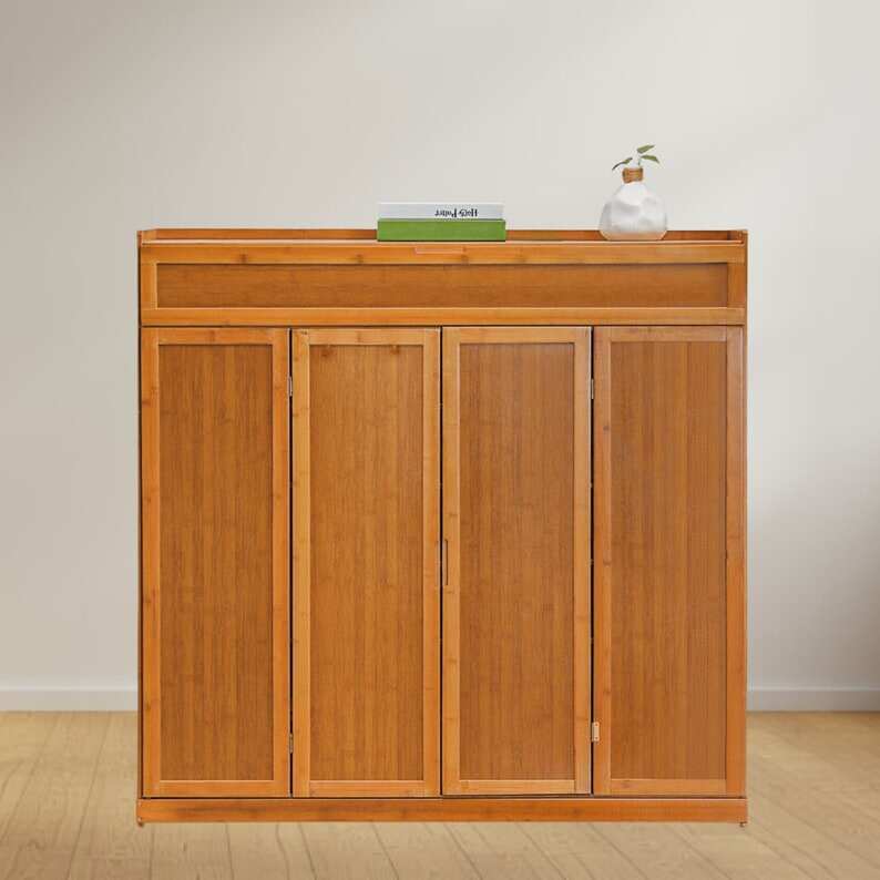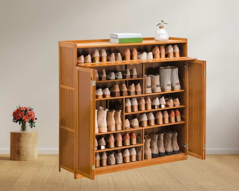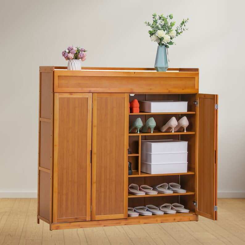 Bamboo Shoe Rack, 7-Tier Shoe Organizer With 2 Bifold door, Sneaker Storage, Boot Storage, Shoe Storage Cabinet, Entryway Shoe Storage