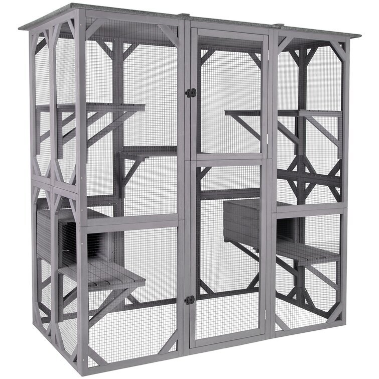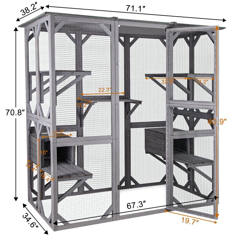 - Oversized convenient front door at 67" with safety latch allows adult people to access the cat enclosure to interact with the pets, while making cleaning easier
