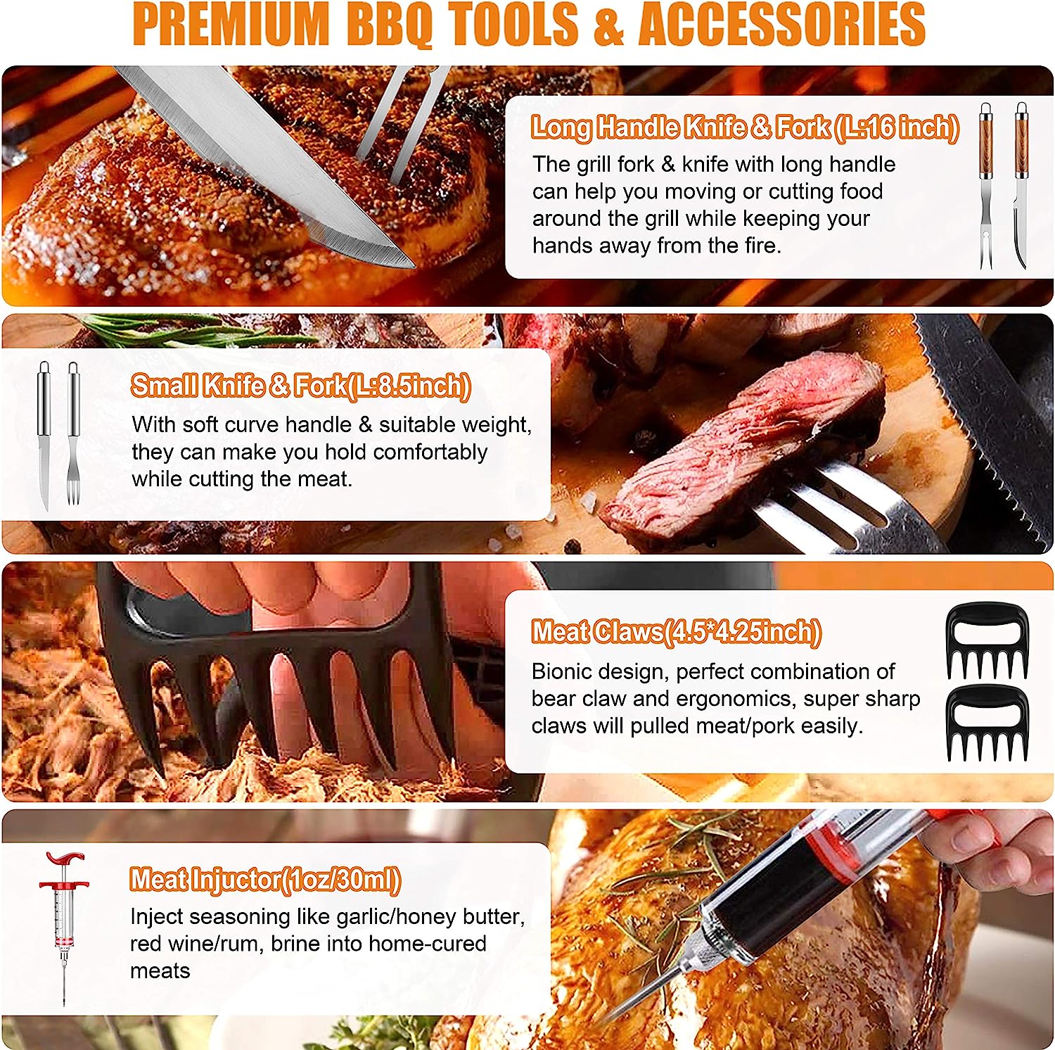 - [Versatile Cooking]: Besides the commonly found versatile tools, this kit comes with many useful items. It includes an instant read thermometer for preventing people from over-cooking their meat; 2 grill mats for cooking delicate meats like fish while preventing food from sticking to the grill; a bbq brush for cleaning the grill after it has cooled down; a meat shredders claws for grabbing large chunks of meat from the grill, separate the meat from bone or tear it.