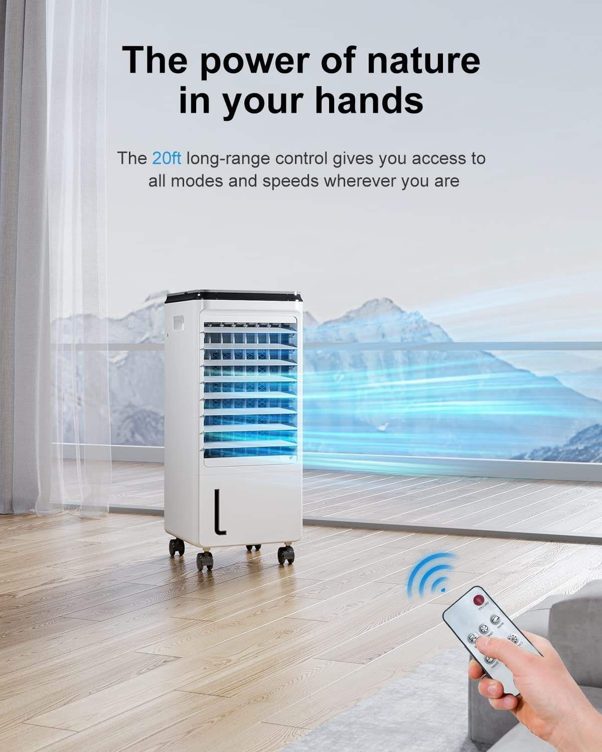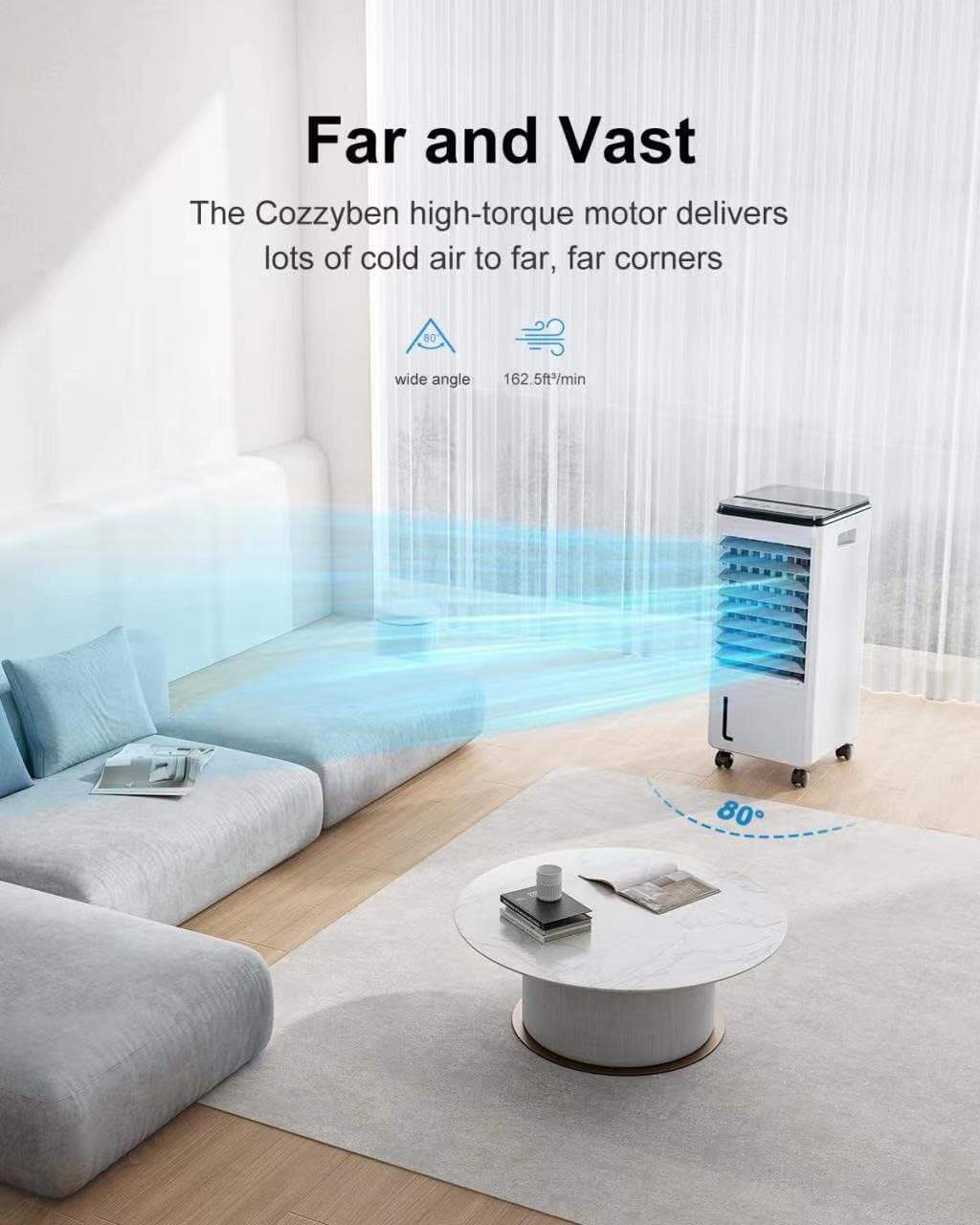- ❄Wide-angle Oscillation & Remote Control for Floor Air Conditioner: 80° oscillation allows the bladeless Swamp cooler to cover a larger area, promoting air circulation and avoiding excessive air concentration. Enhances cooling effects and comfort while reducing the need for multiple fans and energy consumption. Remote control operates at a distance of 20 ft for convenient adjustments from your sofa or bed.