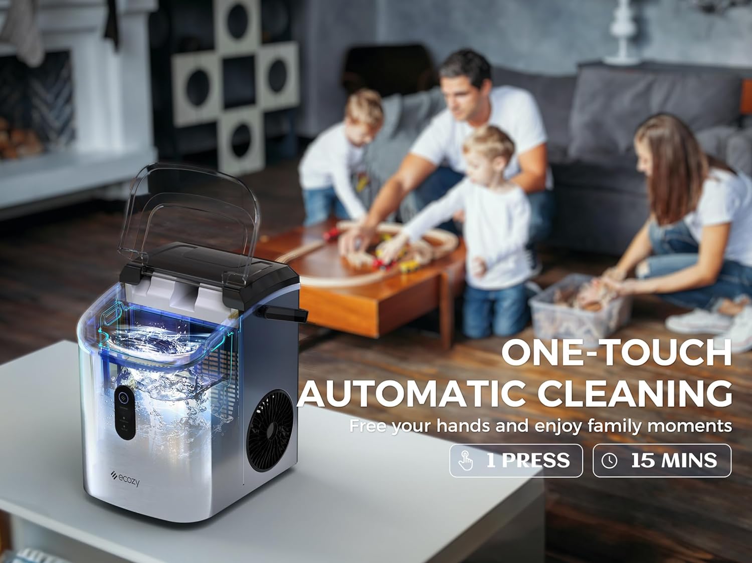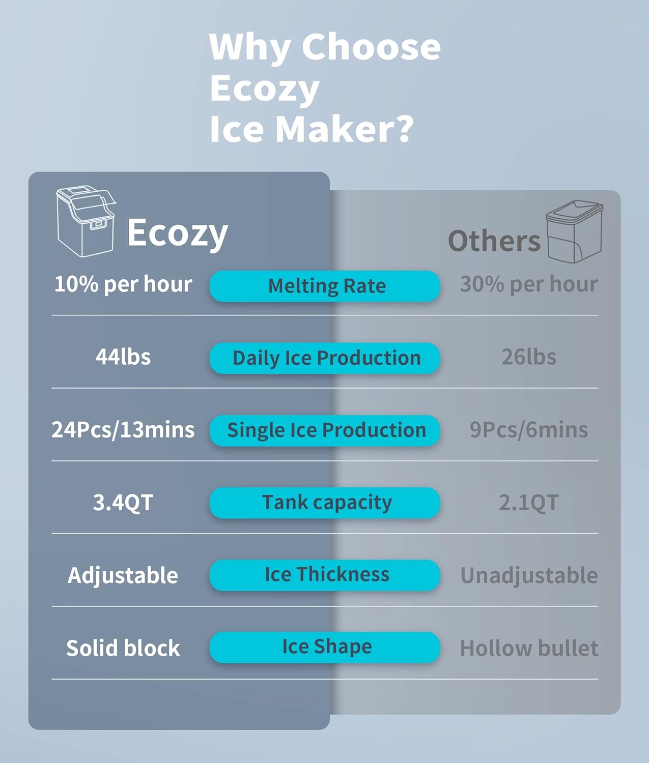 - Crunchy & Munchable Ice - Looking for the ultimate drink experience? The ecozy nugget ice maker serves up chewable and crunchy nugget ice. Unlike bullet ice and square cubes, nugget ice melts slowly and cools drinks quickly, preserving the original flavor of cocktails and other beverages.