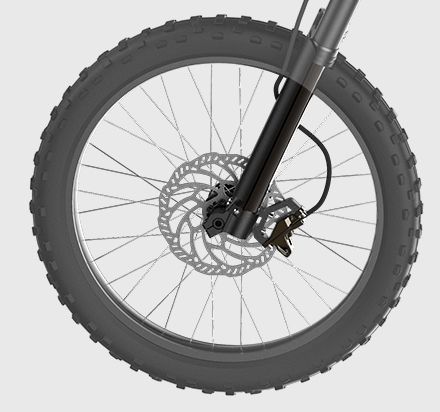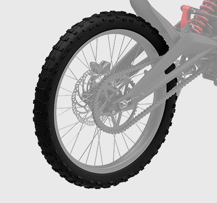 With the perfect level of traction. 184.6 ft*lbs (X260) of torque and a 49.8-inch wide wheelbase. Segway Dirt eBike is well prepared to support riders perform challenging tricks effortlessly. The vigorous rear wheel. featuring 48 rear sprocket teeth and a climbing slope of 45°. allows riders to wheelie or climb stairs with ease.