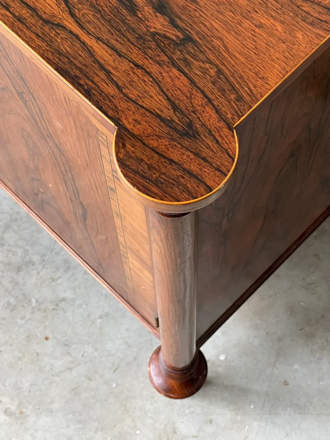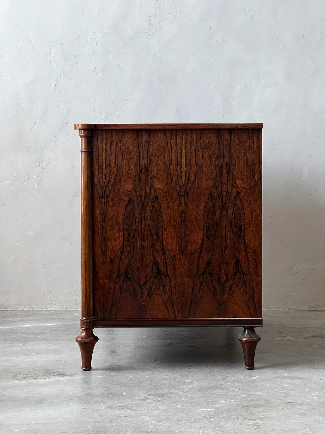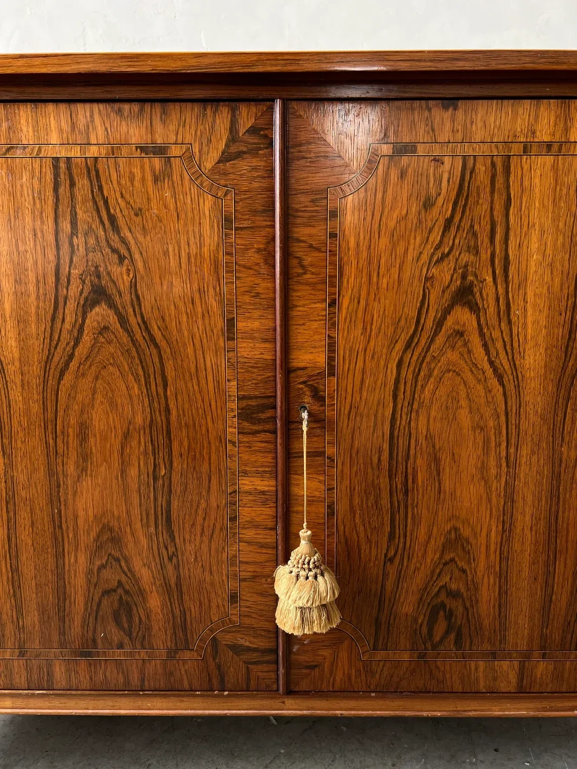 Mid 20th century sideboard of the English regency influence. Remarkable rosewood and inlaid veneer throughout. Very high quality craftsmanship. Interior has two sliding drawers and one sliding shelf.