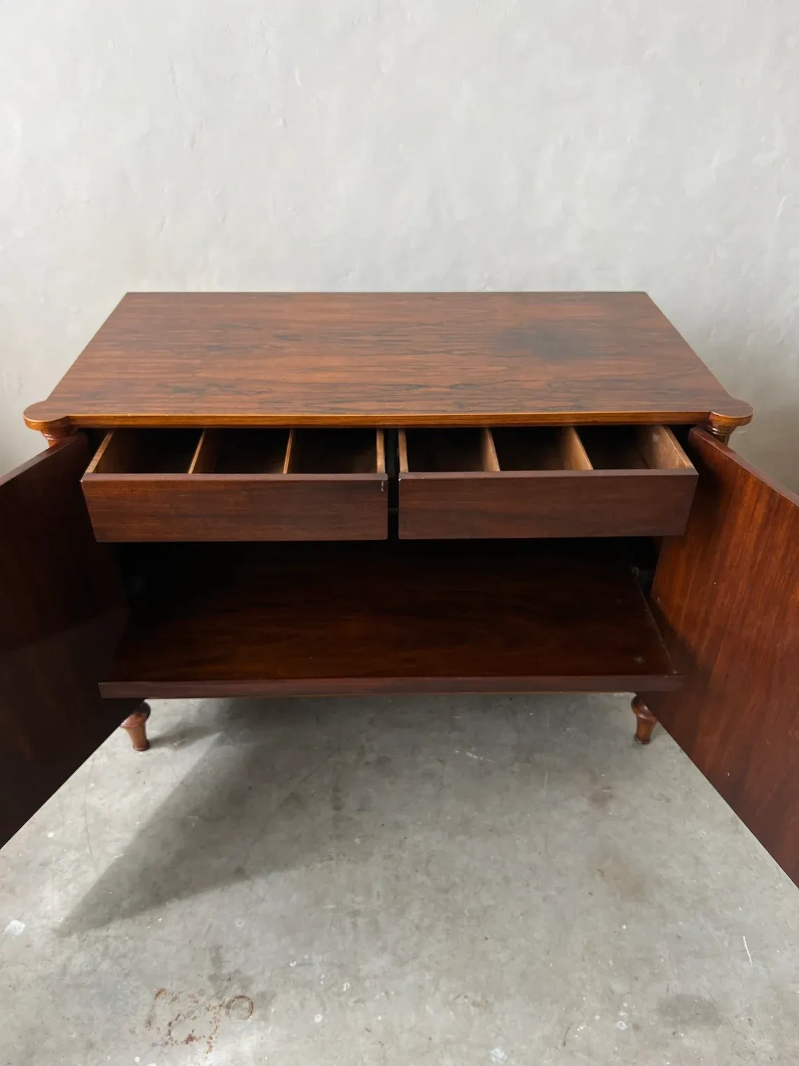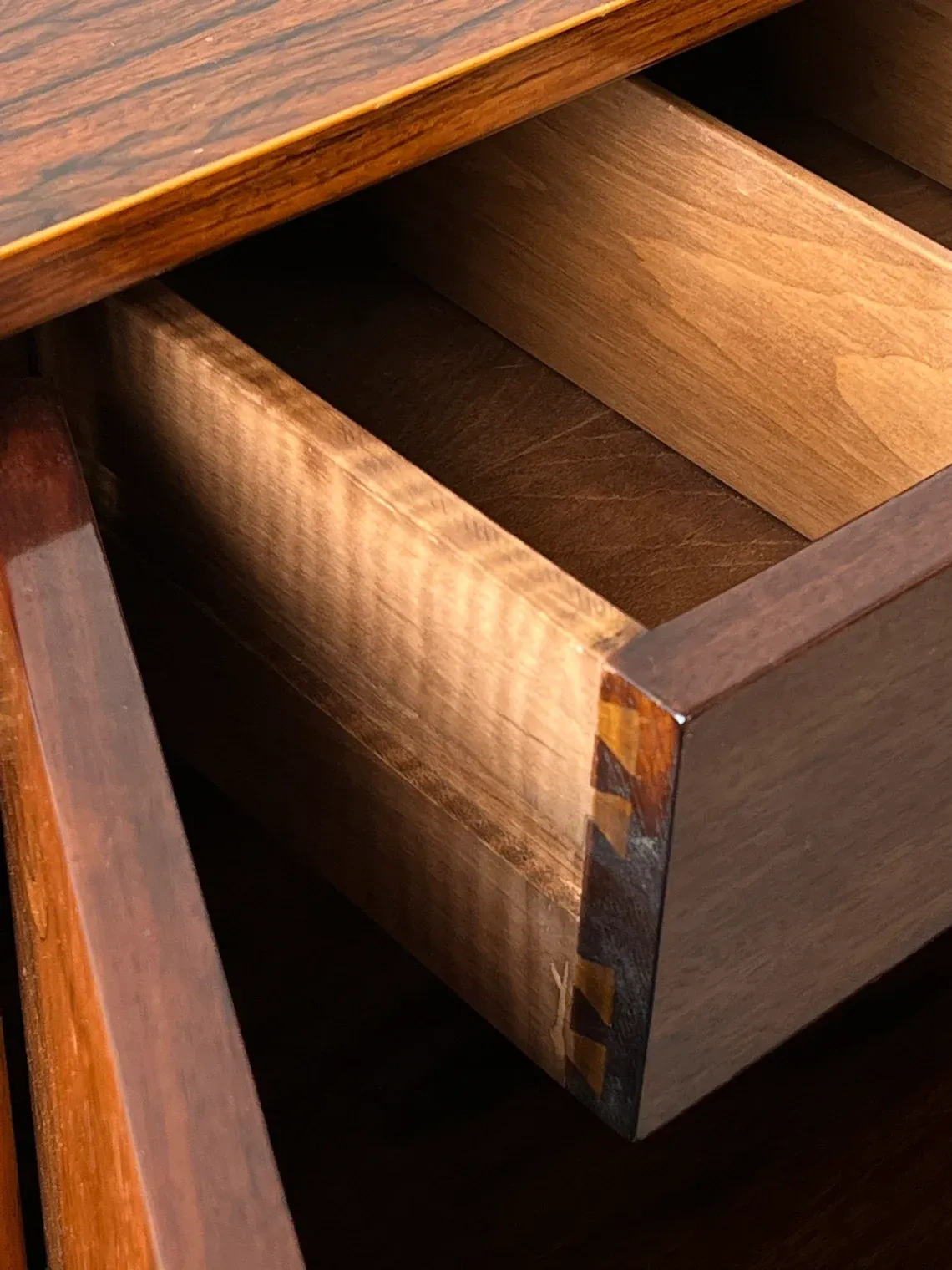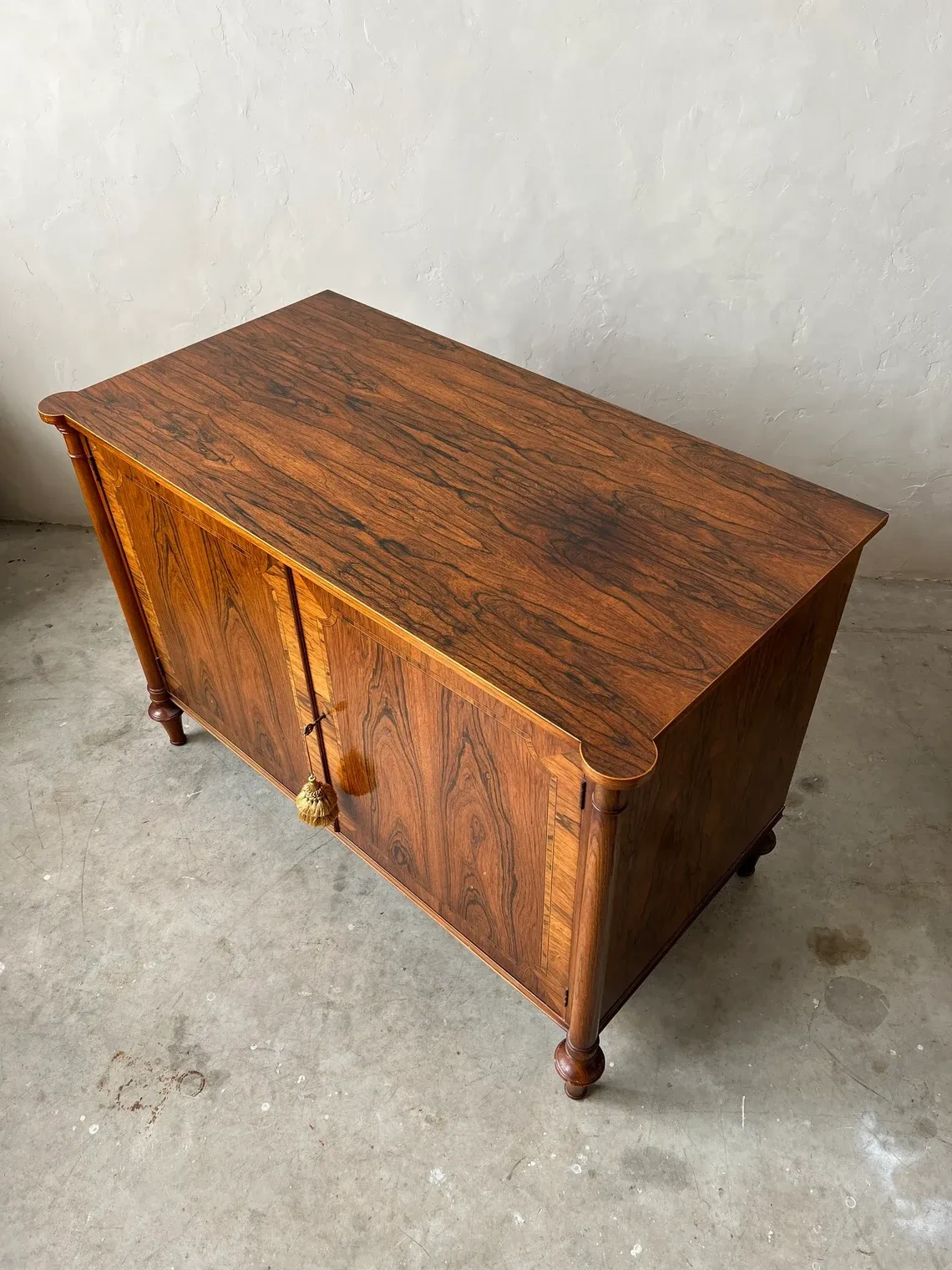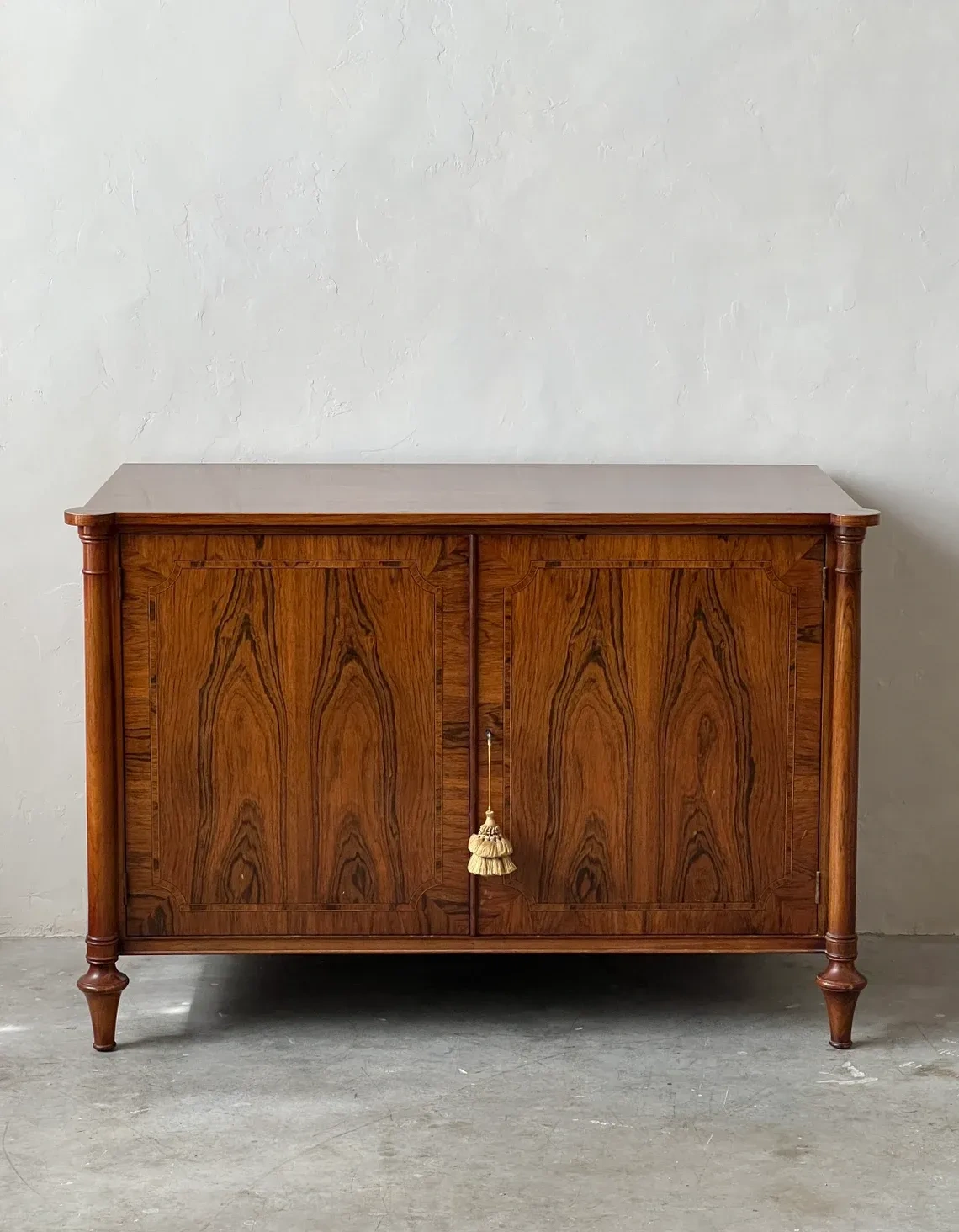 Mid 20th century sideboard of the English regency influence. Remarkable rosewood and inlaid veneer throughout. Very high quality craftsmanship. Interior has two sliding drawers and one sliding shelf.