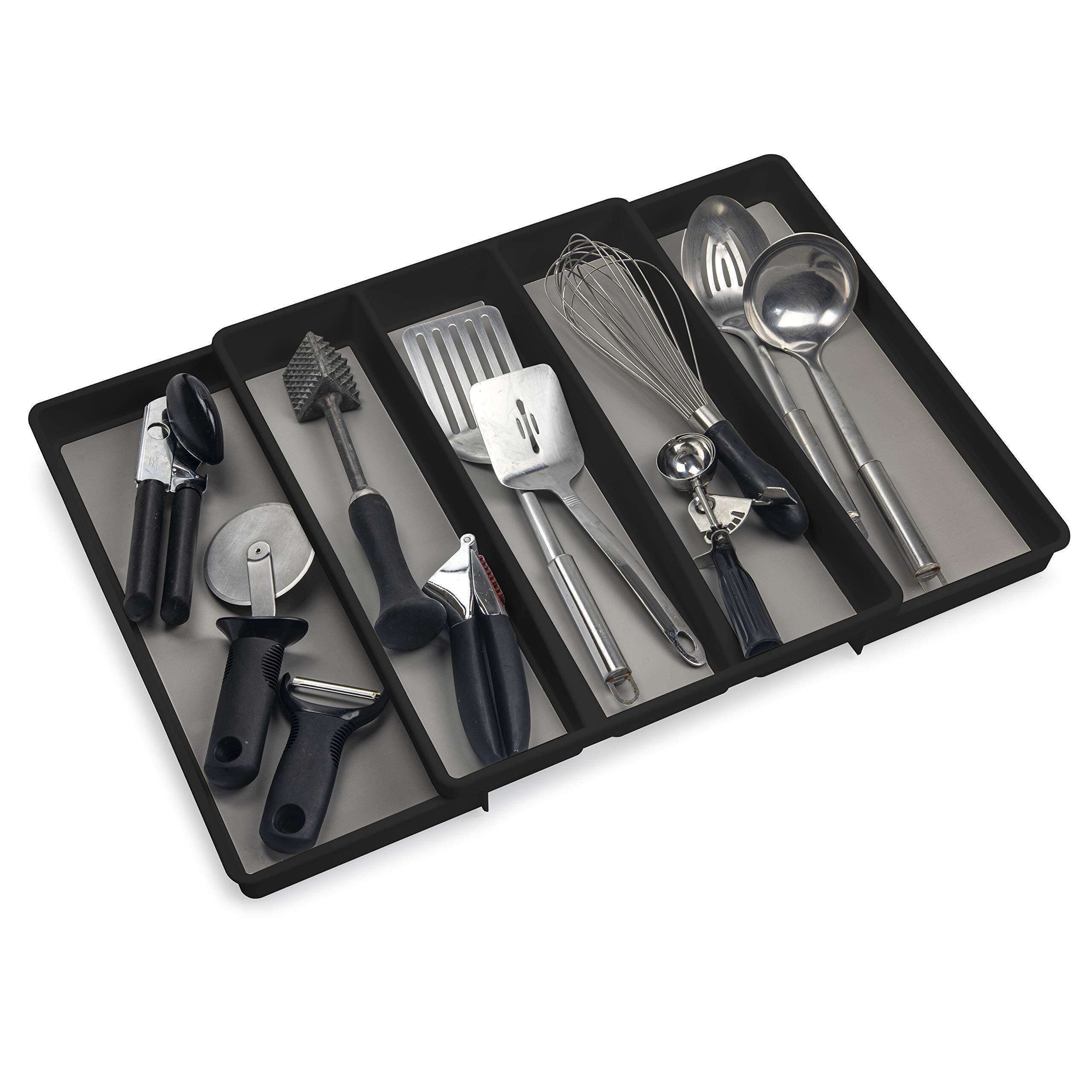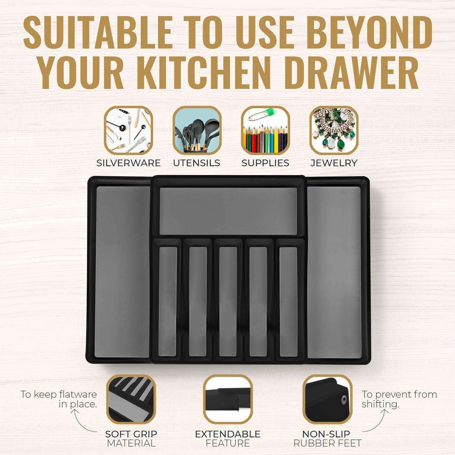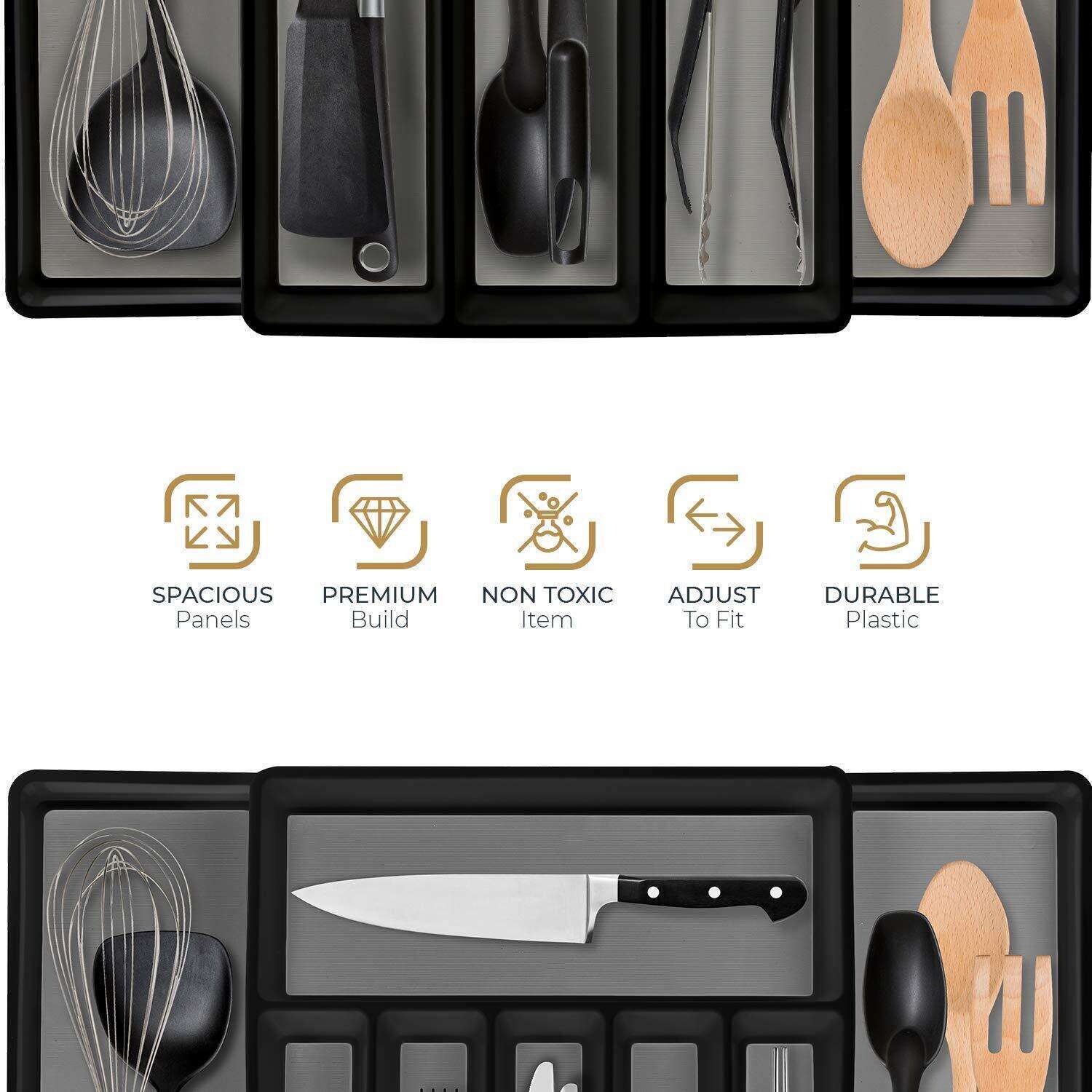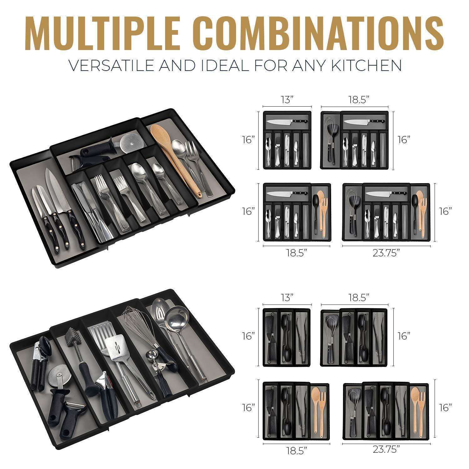 • 2 DIFFERENT ORGANIZERS - ENDLESS POSSIBILITIES: Why settle for a single utensil tray drawer organizer when you can have two of them That's what we thought, and created this 2-piece set of expandable and adjustable non-slip kitchen drawer organizers that will transform your kitchen drawers right on the spot. Double the trays, double the usefulness, double the value. What's not to love/span>