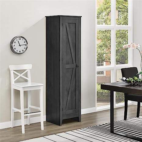 Farmington Wide Storage Cabinet is a stylish way to stay on top of your organization. The rustic barn style design and sleek tapered feet gives the look of an old weathered cabinet but the sturdy laminated particleboard and MDF make this cabinet the perfect piece to house your home office supplies, extra linens, seasonal clothing, nonperishable food and more! Open up the door to 4 spacious shelves, 2 adjustable, to fit items of differing sizes. The weathered brown finish with gray undertones will bring a nice rustic appeal to your space. The Farmington Cabinet is recommended to be assembled and moved by 2 adults. A wall anchor kit is provided for extra safety and security. After assembled, this cabinet measures to be 71.9”H x 18.2”W x 15.8”D.