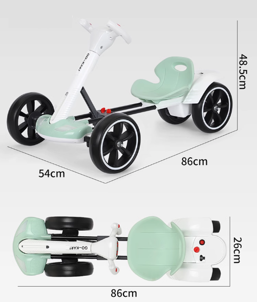 The Foldable Kids Electric Kart now comes with refined dimensions of 86 cm in length, 54 cm in width, and 48.5 cm in height, offering a slightly extended frame for a more comfortable ride. When folded, it compacts down to a height of just 26 cm, making it incredibly easy to store in tight spaces or transport in a car trunk. This enhanced portability, combined with its sturdy construction, ensures that it is both convenient for parents and enjoyable for kids.