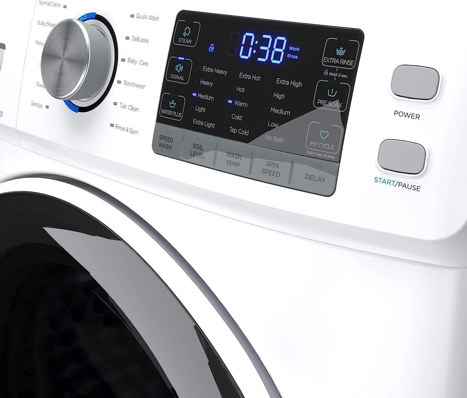 - Steam and Water Plus Functions – The steam function is great for removing wrinkles quickly or deep-cleaning dirt, The Water Plus Function Adds water to the cycle to enhance wash performance on large, bulky items. this front-loading washing machine gives you multiple options for washing and preparing clothes for improved cleanliness.