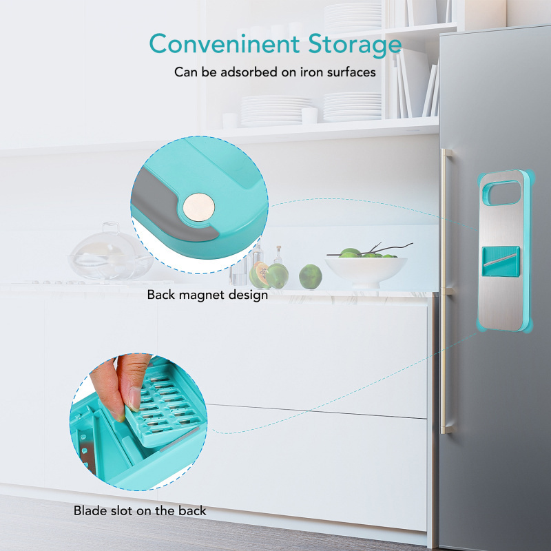 This mandolin slicer is made of durable stainless steel that is easy to clean. High-quality plastic and stainless steel can extend the life of the slicer and save you time and money. The bottom of the vegetable slicer is equipped with rubber to improve stability during use and reduce the risk of injury to the fingers caused by the vegetable slicer slipping when using the vegetable slicer.