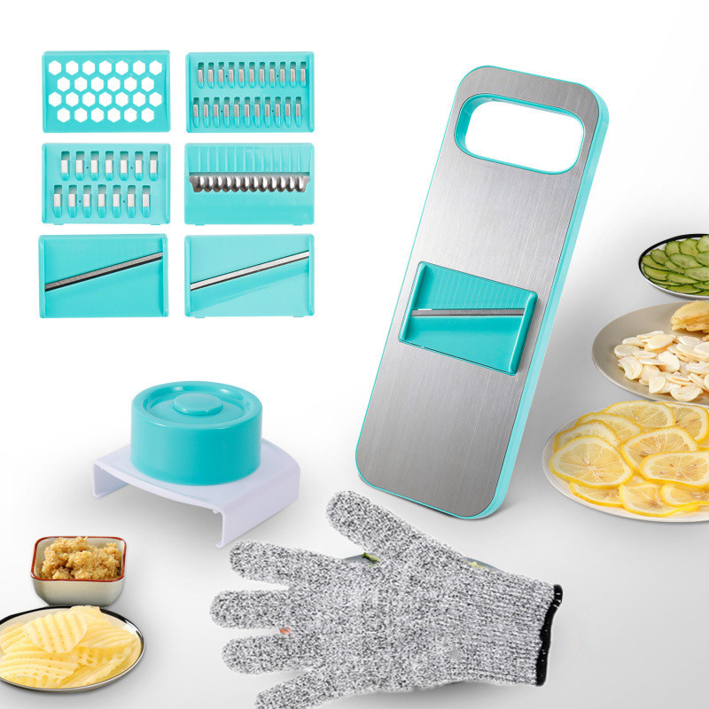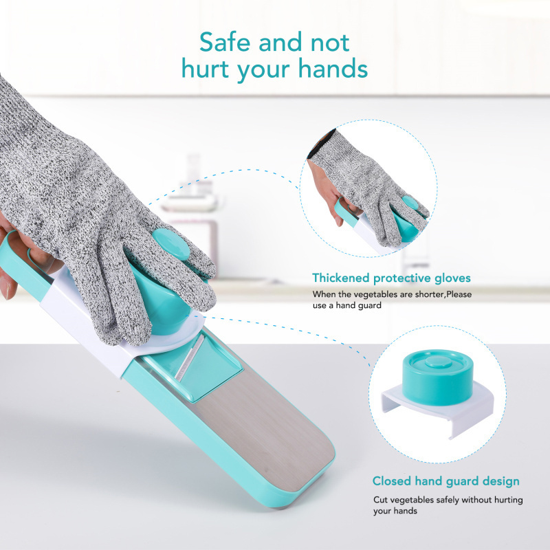 There is a protective plastic cover over the vegetable slicer to protect it from the blades when not in use. At the same time, gloves are also provided so that you will not hurt your fingers during use. At the same time, a protective cover will be provided as a gift so that you can cut small foods better.