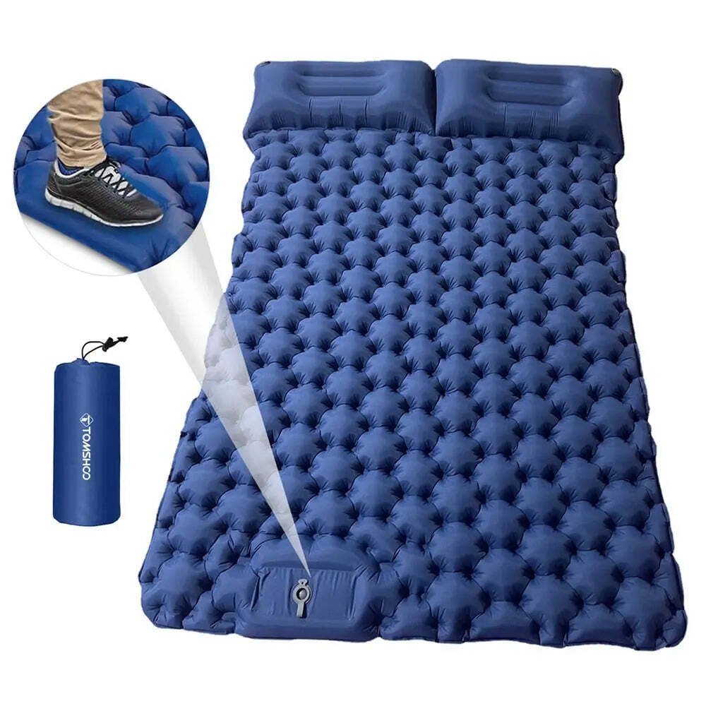 This inflatable mattress 2 person camping mat is a reliable and convenient sleeping solution for outdoor enthusiasts. This inflatable mattress comes with an integrated air pillow and offers excellent comfort and support while you rest. It is designed to be portable and waterproof, making it ideal for backpacking and camping trips. Whether you're exploring the wilderness or simply enjoying a night under the stars, this sleeping pad ensures a comfortable and restful sleep.