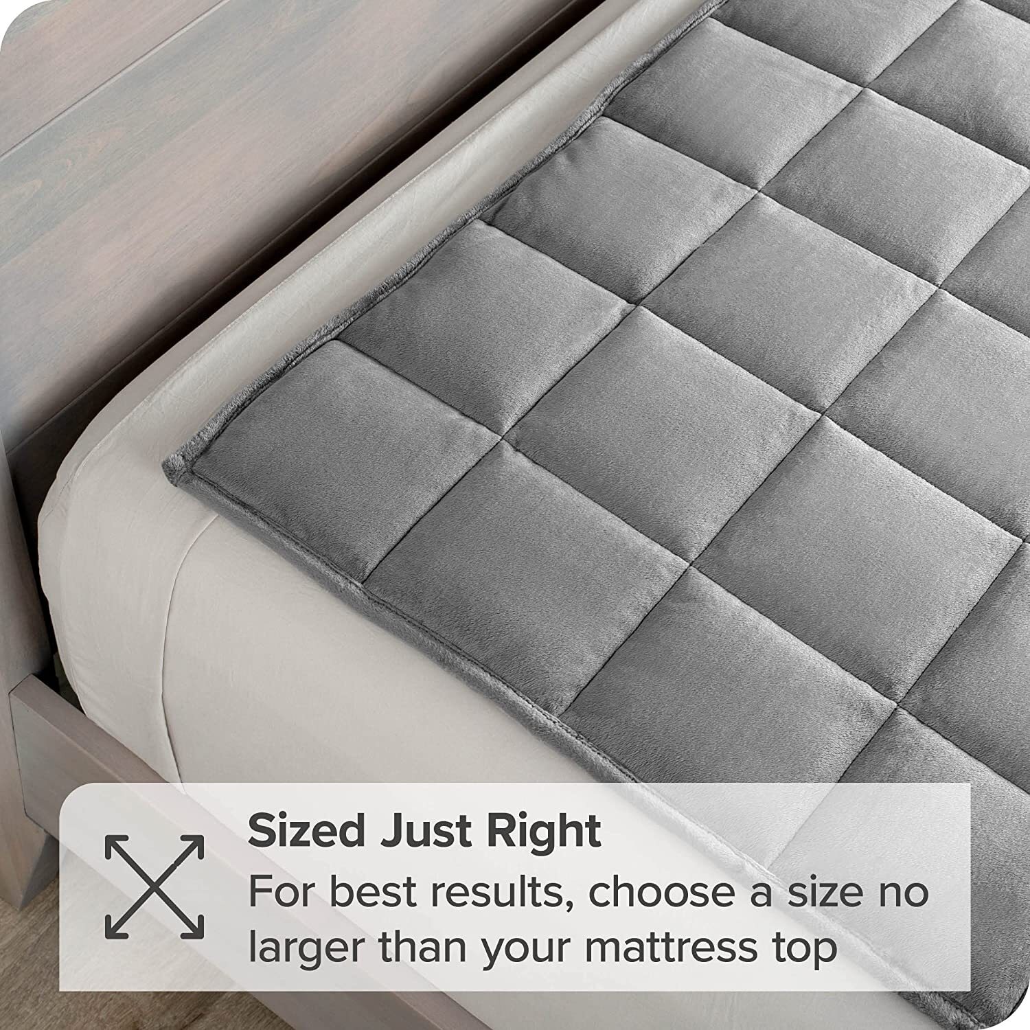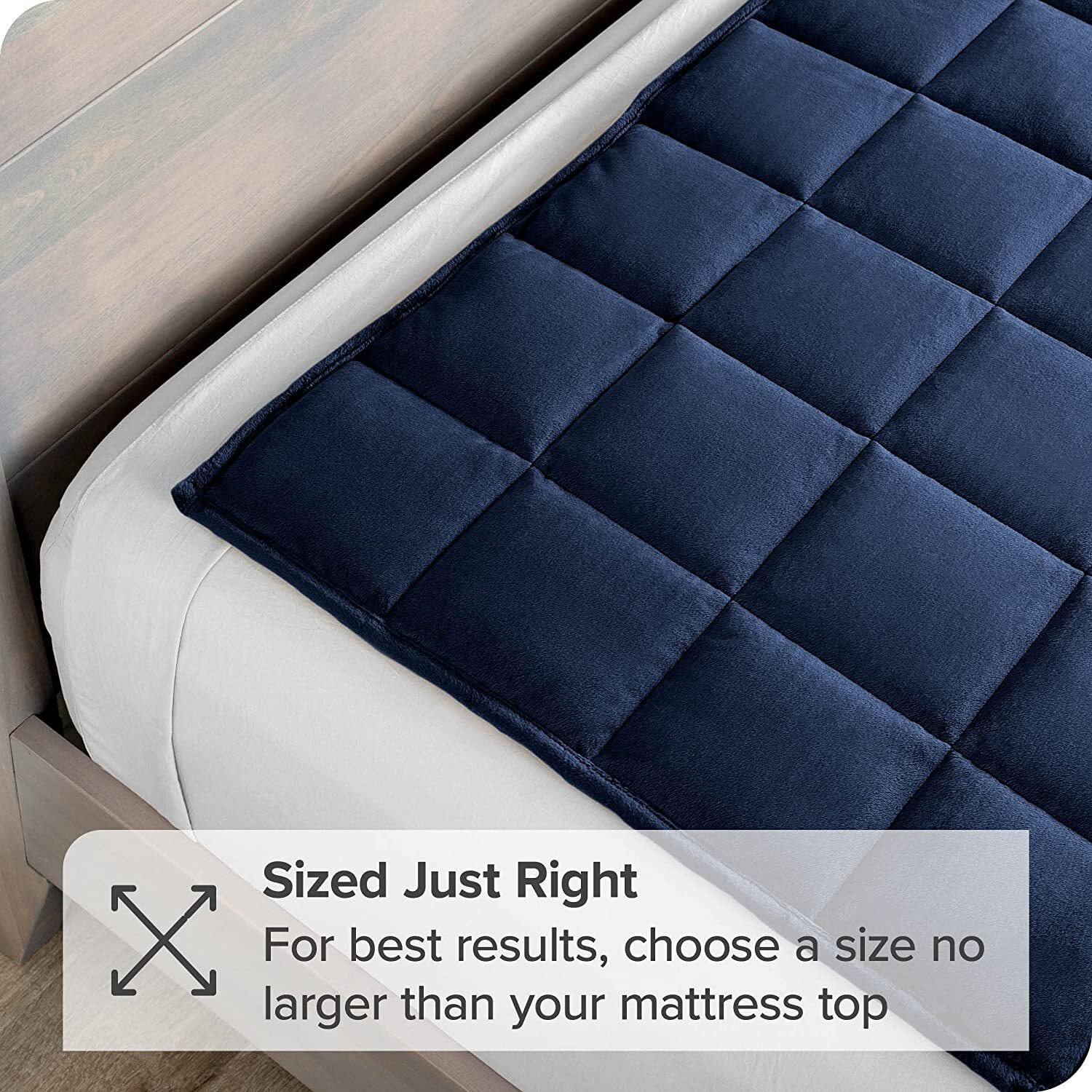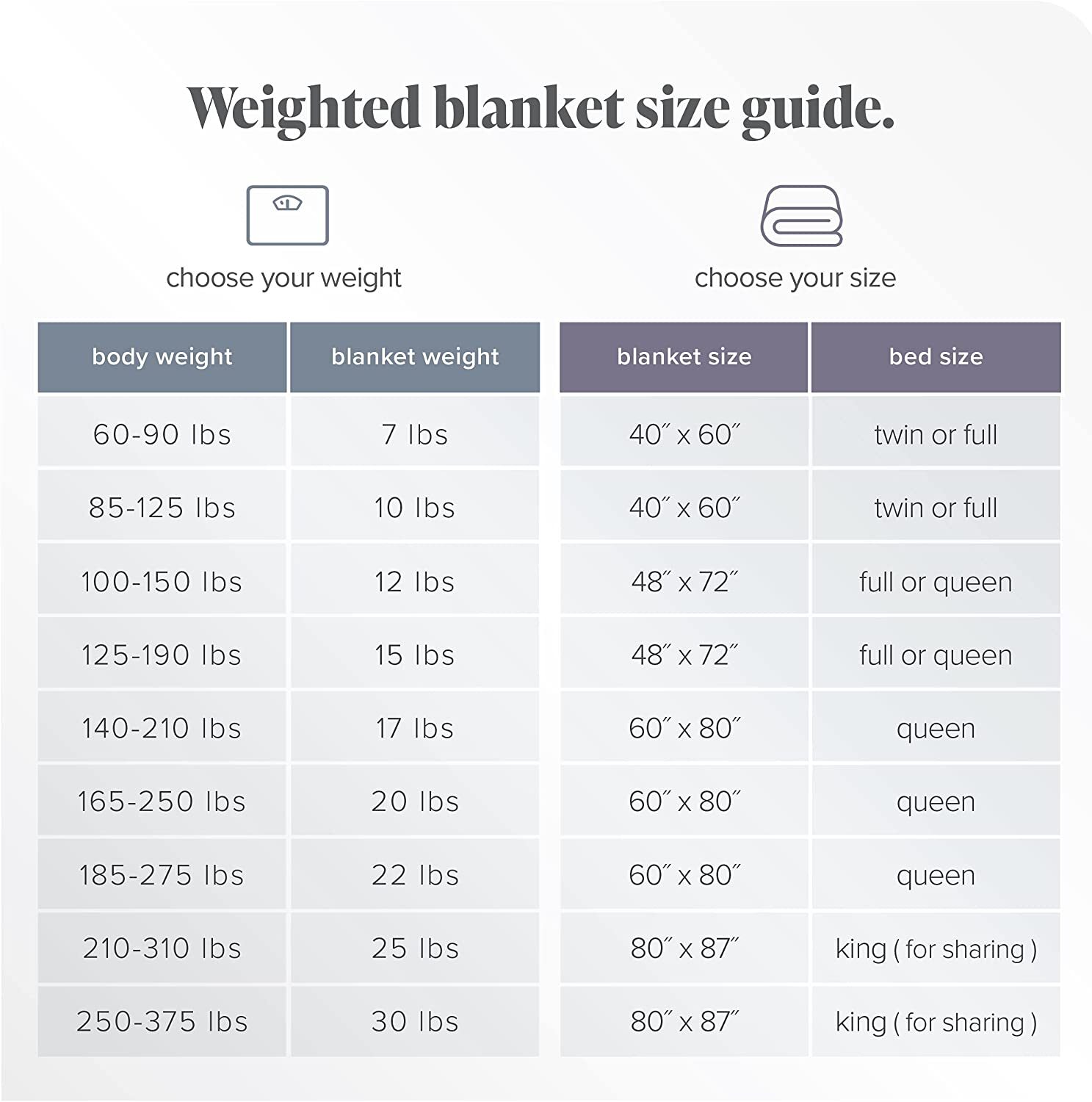 - HOW TO CHOOSE: The weight of the blanket should be about 10% of your body weight. For example, a 150 lb adult would use a 15 lb weighted blanket, and a 65 lb child would use a 7 lb weighted blanket. The blanket should be no longer in size than the top of your mattress and should not hang over the sides of your bed. Please reference our chart to determine which blanket is right for you.