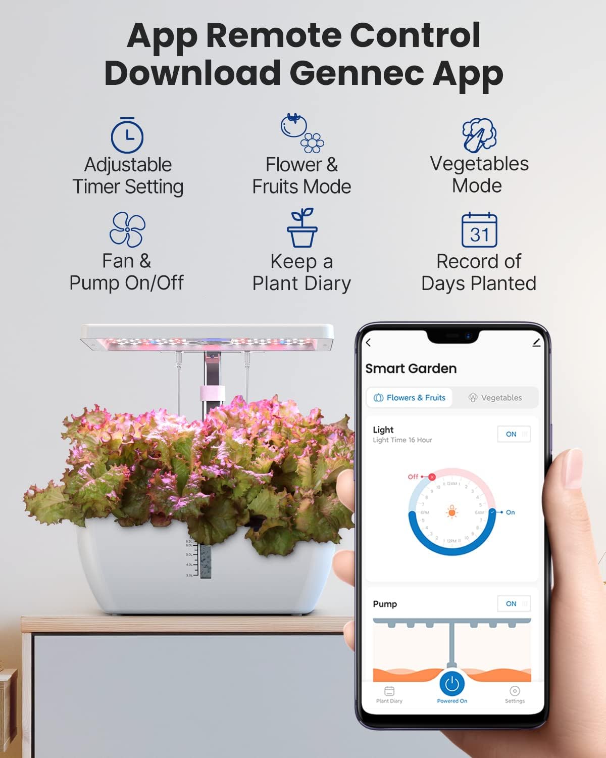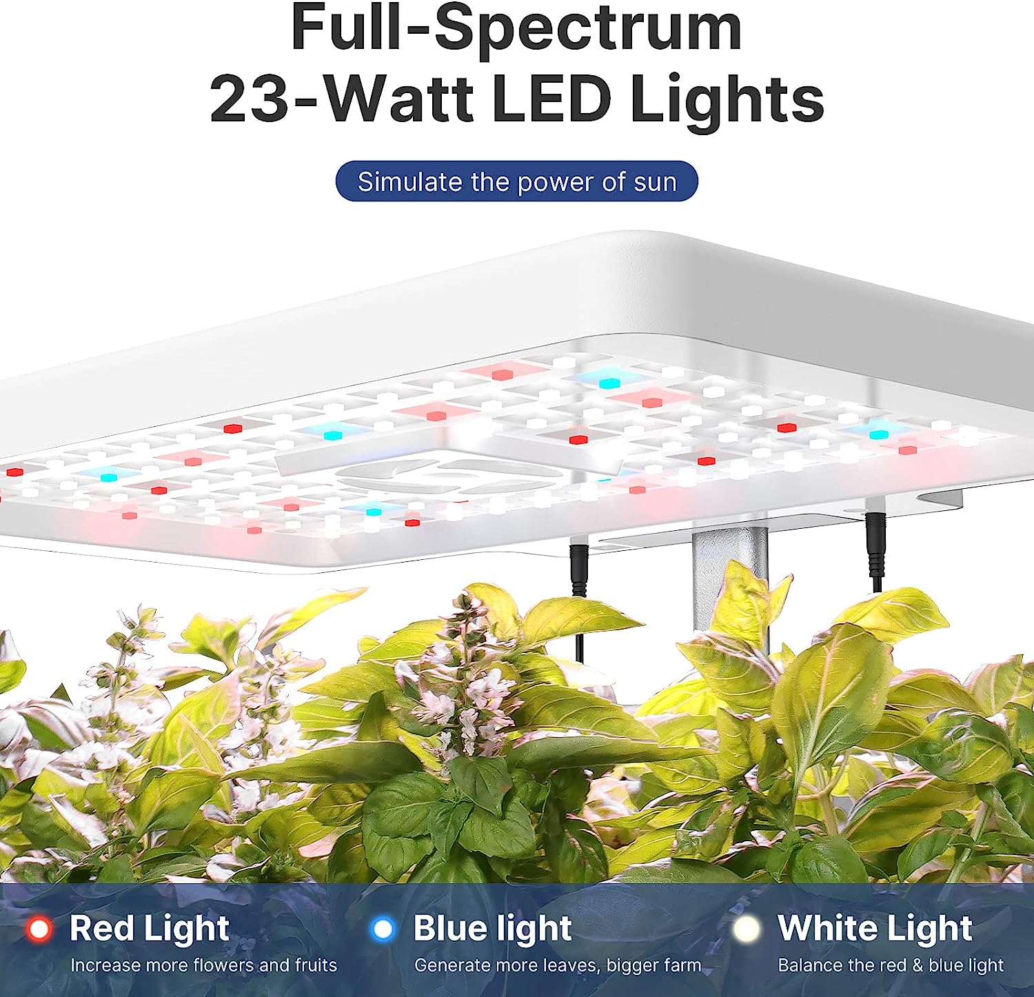- 2 Growing Modes: 22-Watt LED light of hydroponics growing system turns on/off automatically, simulate the sunlight spectrum, promoting plants' photosynthesis in any weather. Vegetables Mode emits blue light, red light, far red light and white light; Flower/Fruit Mode emits red light, far red light and white light.
