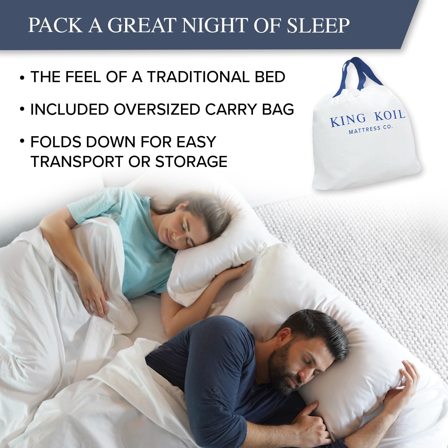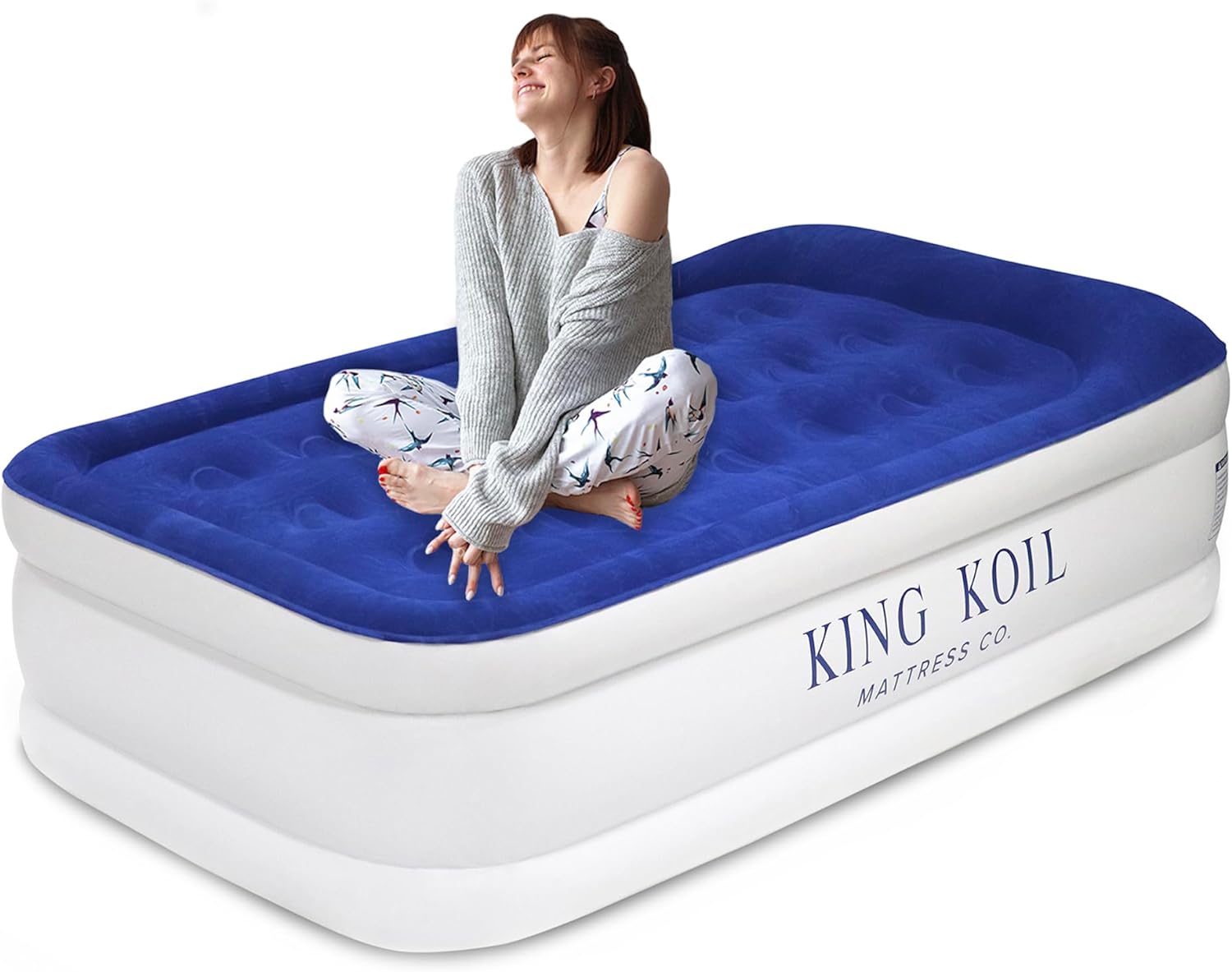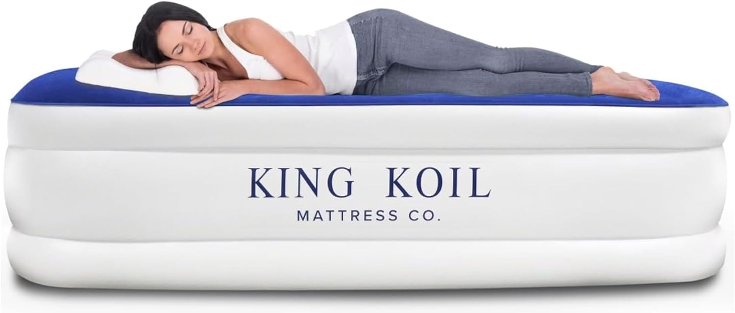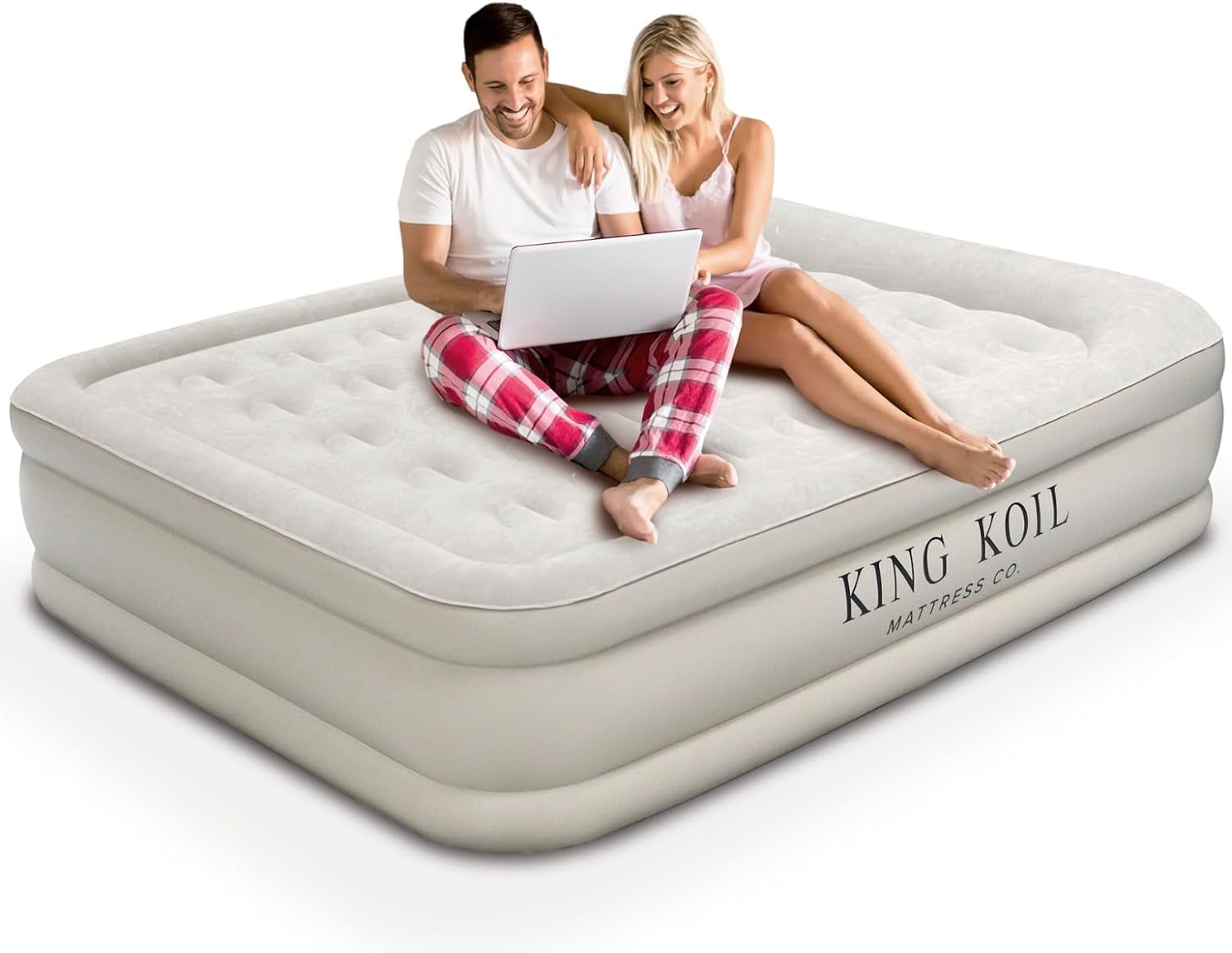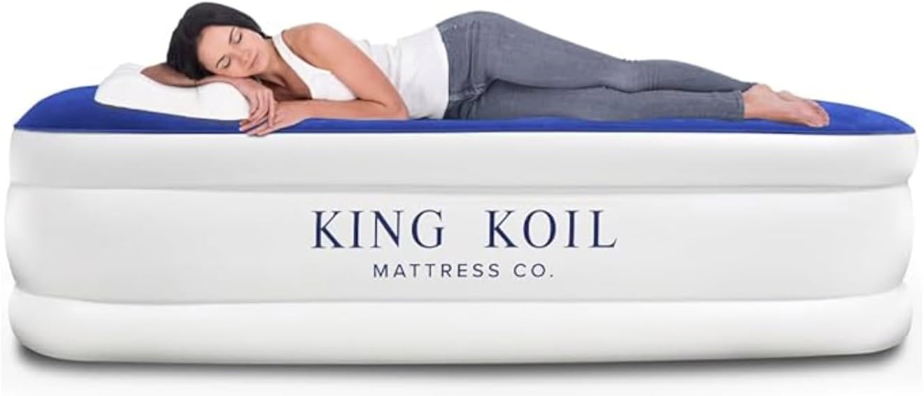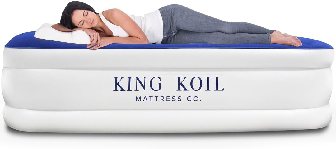 - KING KOIL LUXURY QUEEN AIR MATTRESS WITH A 1-YEAR WARRANTY DIRECT FROM THE MANUFACTURER: Experience unparalleled comfort with our Queen-sized airbed, featuring a luxurious pillow top, soft flocking layer and enhanced coil-beam construction for maximum support. Built to last with durable, waterproof, and puncture-resistant materials, this air mattress is your go-to solution for a restful night's sleep.