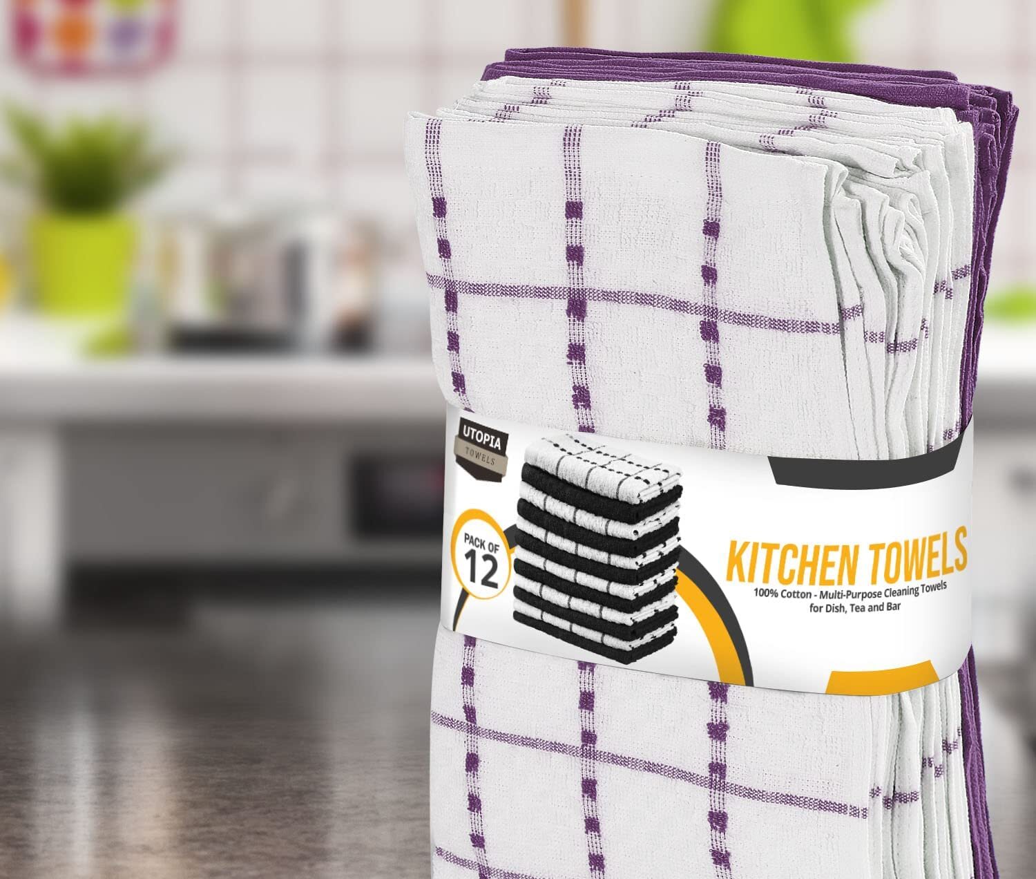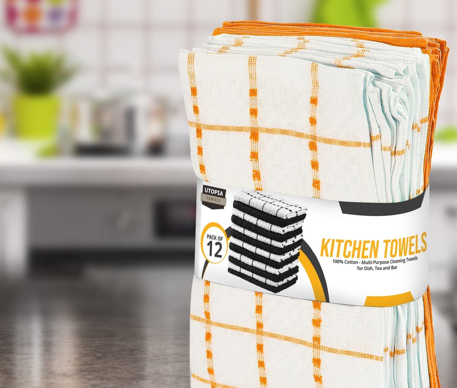 - VALUE PACK- Set includes 12 cotton dish towels with six black and six white dobby weave style kitchen towels measuring 15 x 25 inches