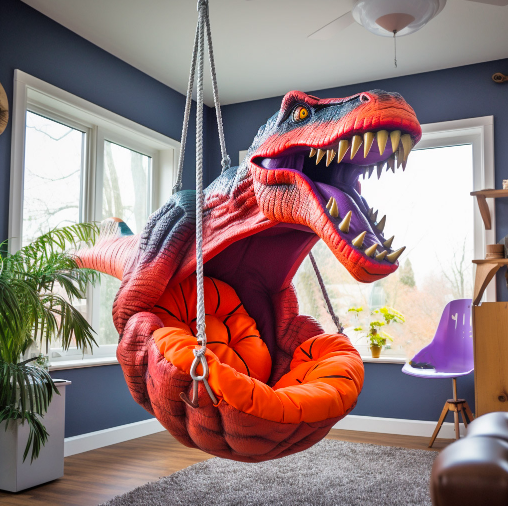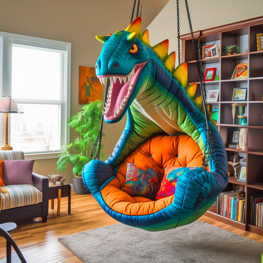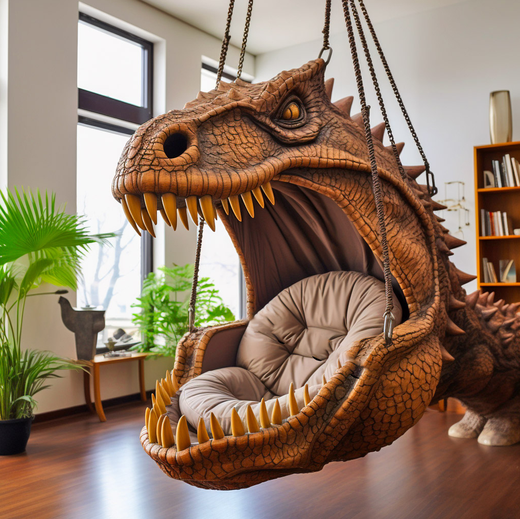 Imagine a lounger that hangs like a hammock, but instead of a simple fabric swing, there’s an artfully crafted dinosaur craving your company.