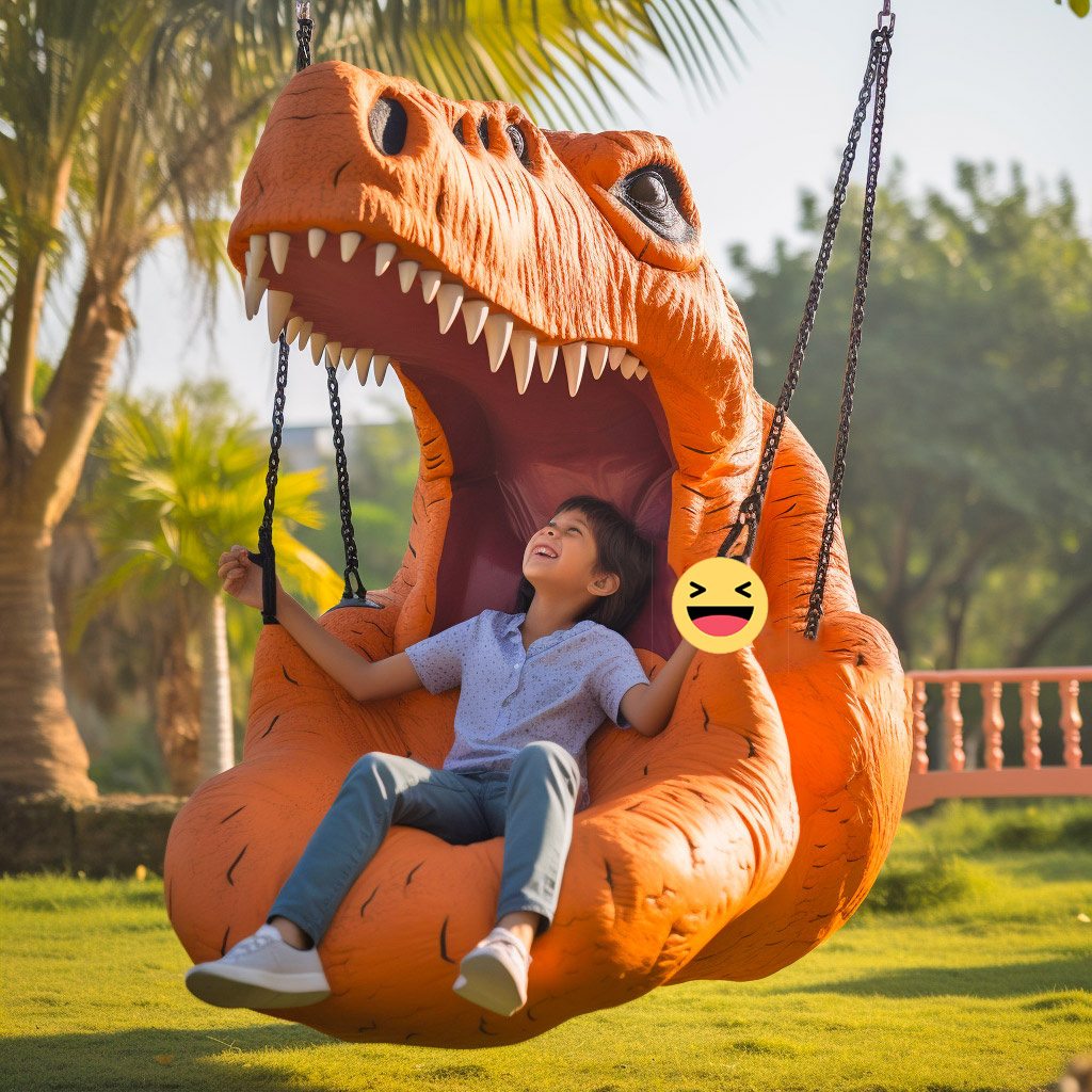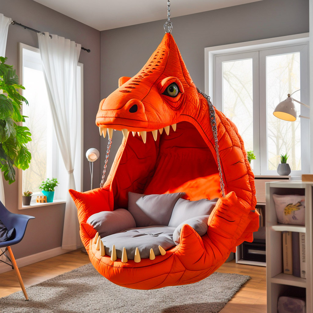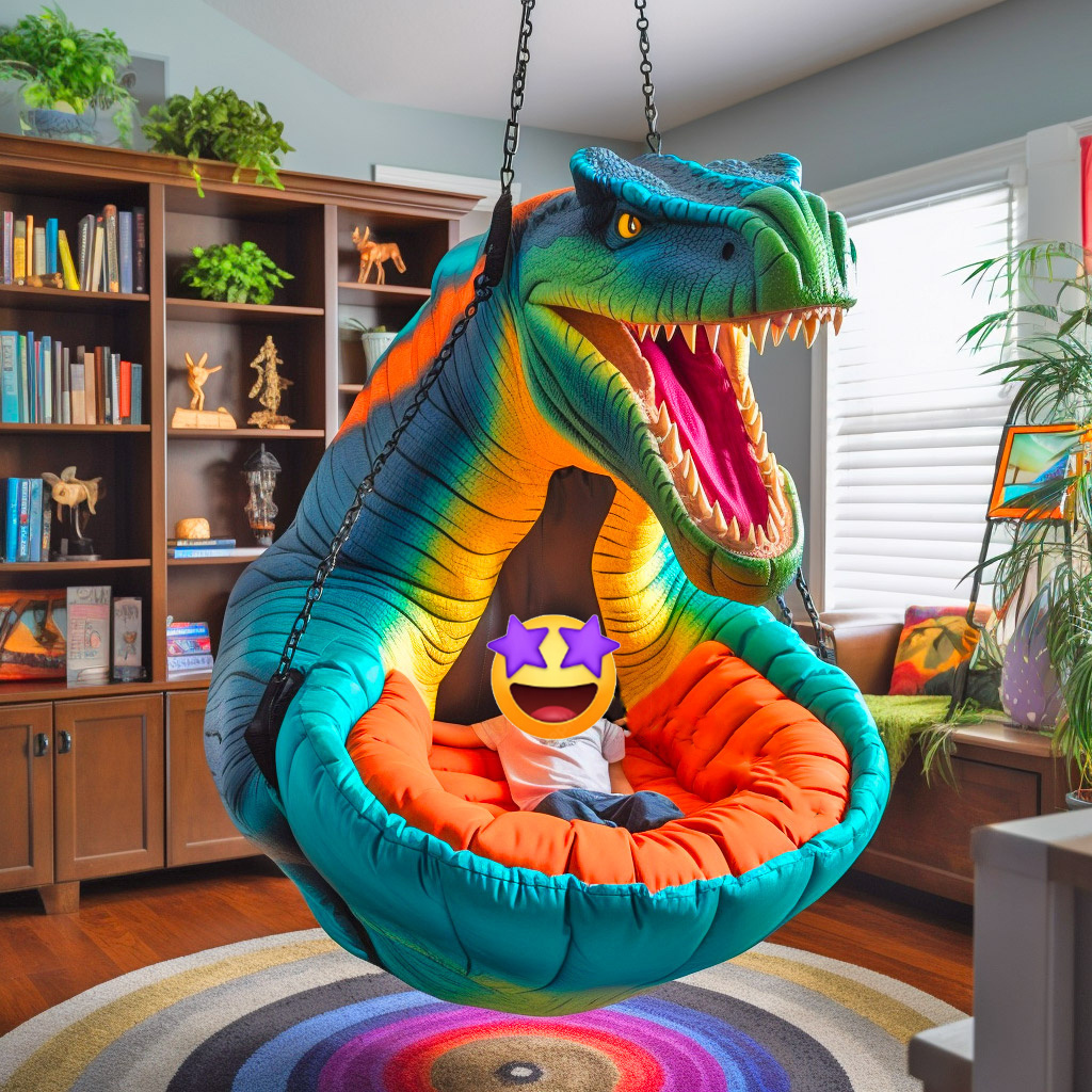 Imagine a lounger that hangs like a hammock, but instead of a simple fabric swing, there’s an artfully crafted dinosaur craving your company.