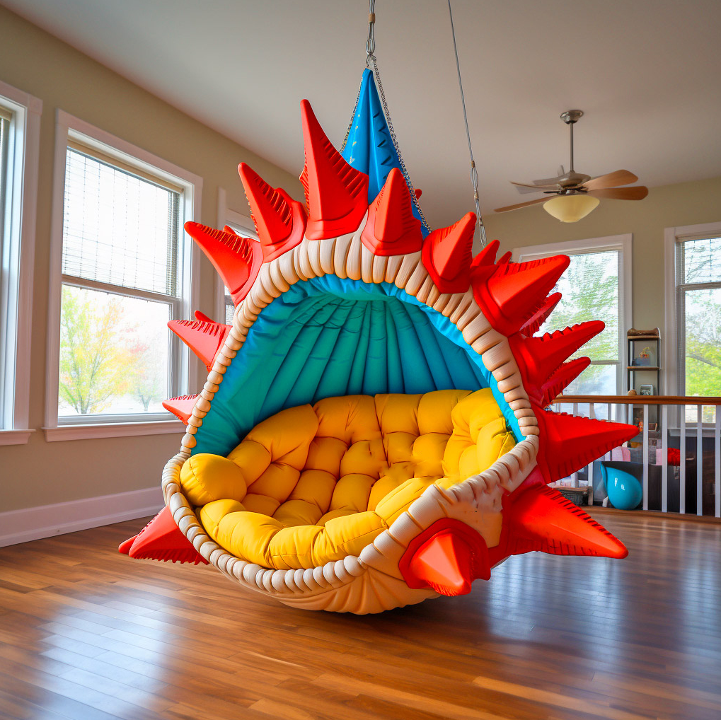 Gaze in awe as the seat of your lounger is cunningly placed inside the gaping maw of a ferocious carnivore, those sharp teeth eager to… cuddle?