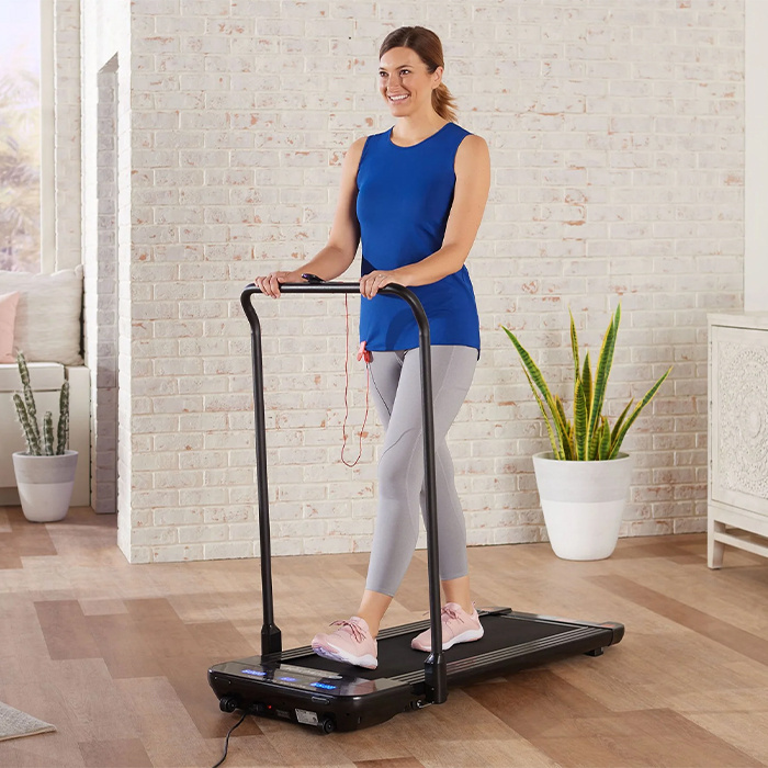 Your fitness resolutions — they’re still here, and they’re about to gain major traction with the walking treadmill in your home. It’s specially designed for walking speeds, is flat-folding, and has a base that’s a slender 5″H. What’s that mean for you? No major takeover of your living room and no more facing the elements, uneven neighborhood terrain, or scary gym fees to get your daily exercise in.