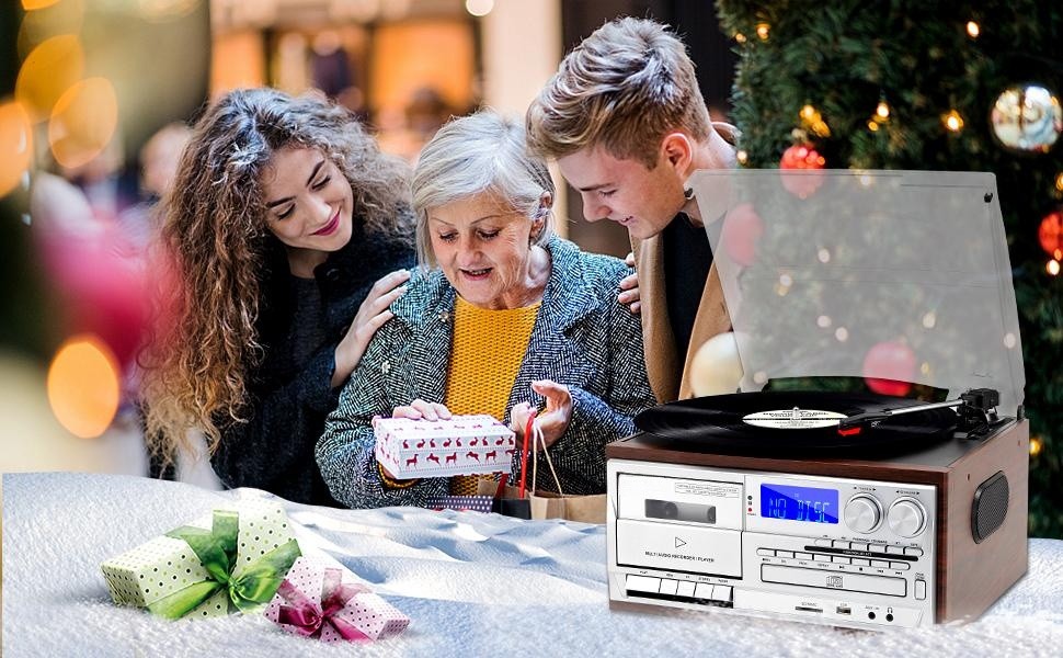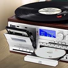 Adopt integrated design, the cassette and CD slot are designed on the front of the record player. You can easily insert favoriteCD/Cassettetape into the player and enjoy it through bulit-in stereo speakers.
