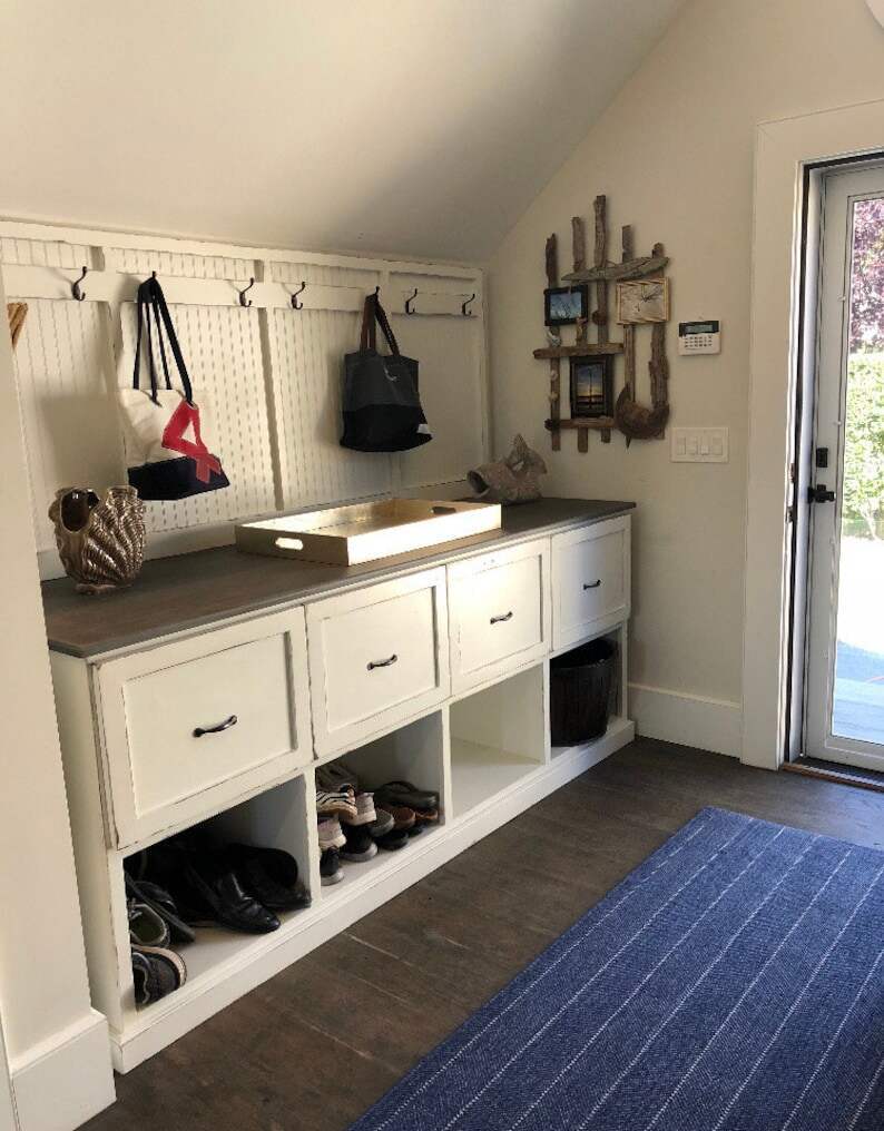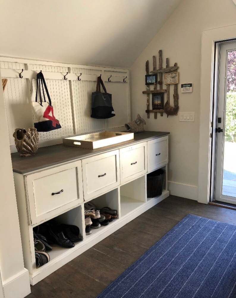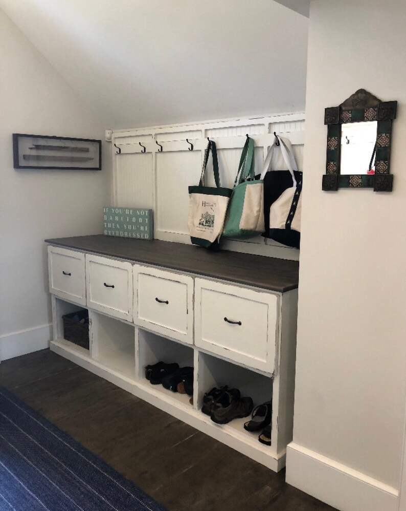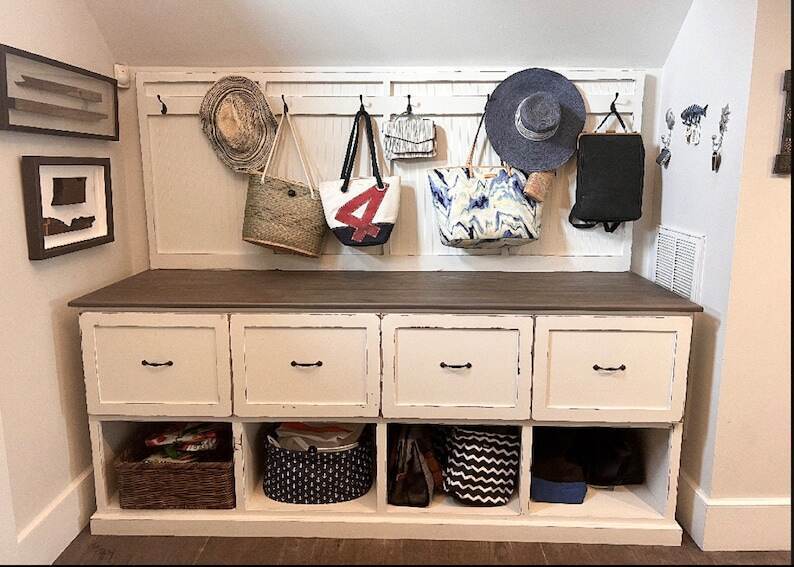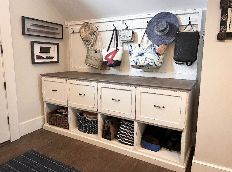 A mudroom bench entryway organizer with shoe storage and a coat rack makes for a great entryway organizer for any home! This unit is made to order and comes with 10 hooks and the drawers come with 100 pound drawer slides.