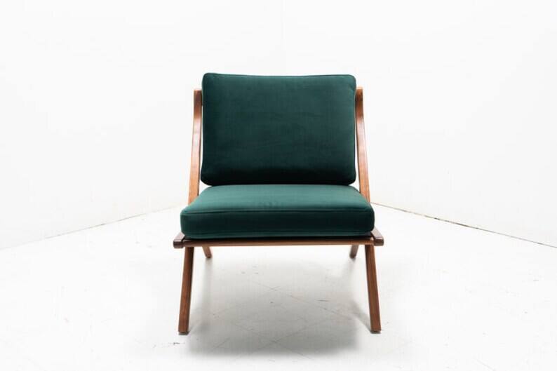 Our Folke Ohlsson inspired scissor chair is an iconic mid century silhouette. The chair is made of walnut that is finished with a natural oil and custom made to order in your choice of fabrics.