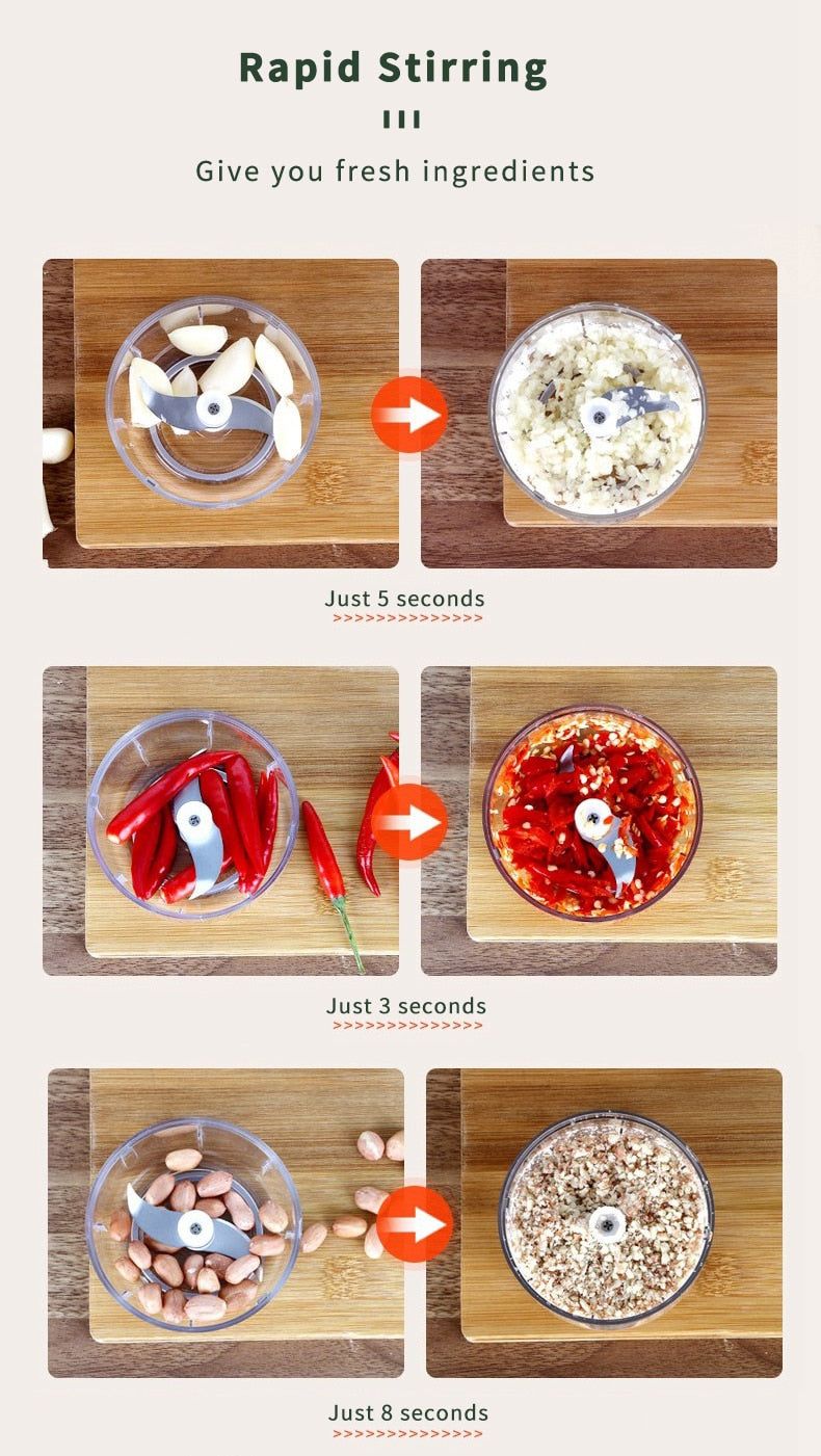 3. Quick Chop: The sharp blade of the garlic chopper can quickly chop garlic, spices, nuts, vegetables, meat, ice cubes, etc. It is very suitable for small foods. You can use it for cooking, supplementing baby food, smoothie drinks.