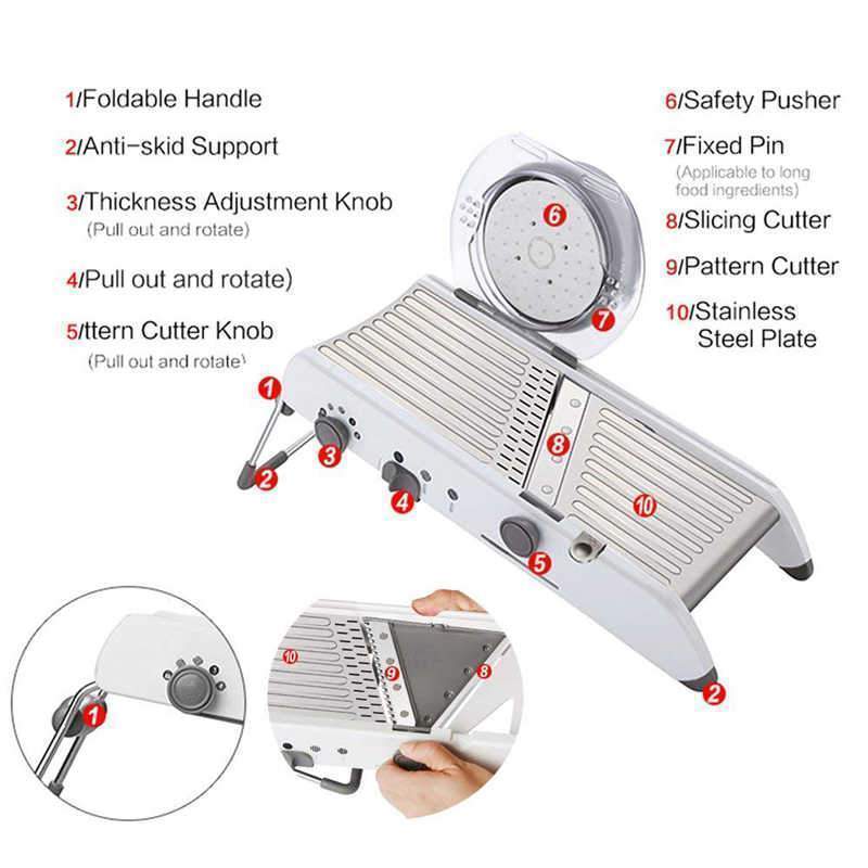 - Multi-function mandolin slicer for adjustment of 18 different sizes of slices and chips