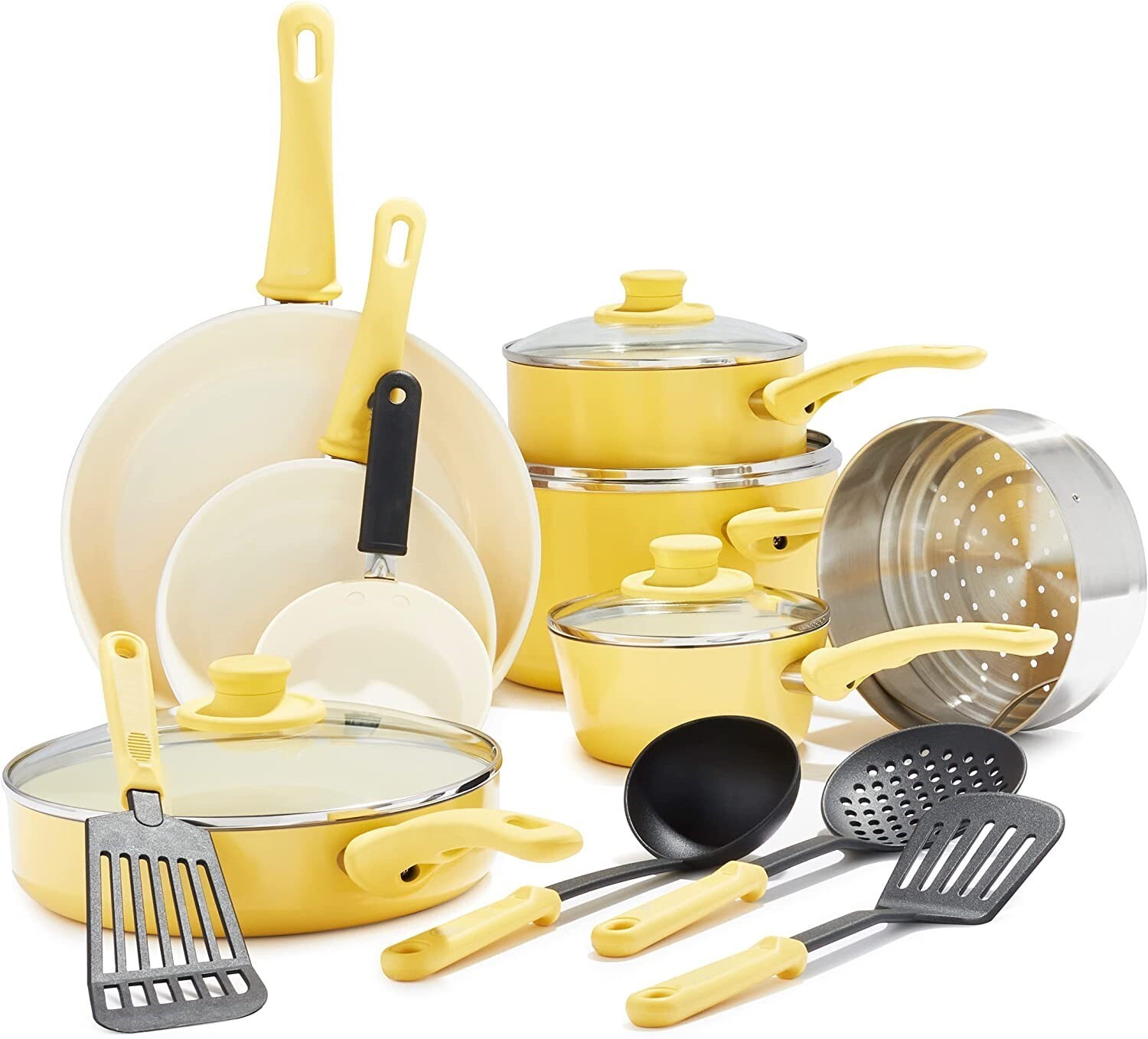 - Cookware set includes: 4” mini frying pan, 7” and 9.5” frying pans, 1 quart and 2 quart saucepans with lids, 5 quart stock pot with lid, 2.5 quart saute pan with lid, 7” stainless steel steamer, and 4 kitchen utensils