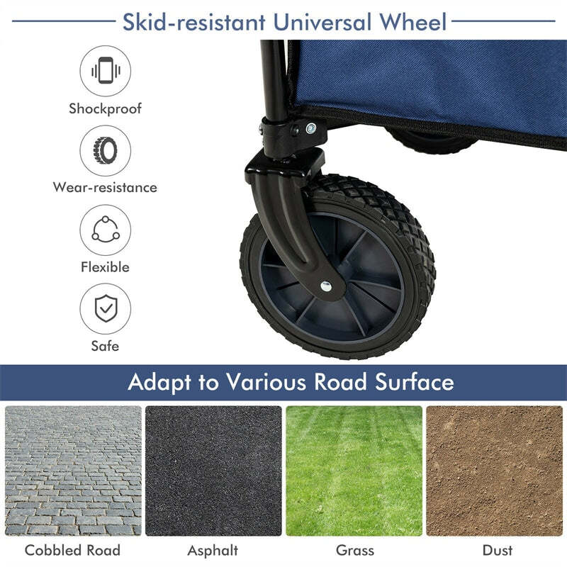 - 360° Universal Wheels: This collapsible utility garden trolley buggy is equipped with four 7" diameter all-terrain wheels, including two 360 degree rotatable front wheels. That can ensure they are capable of rolling on different grounds, from cement to wood floors, from stone roads to sand.