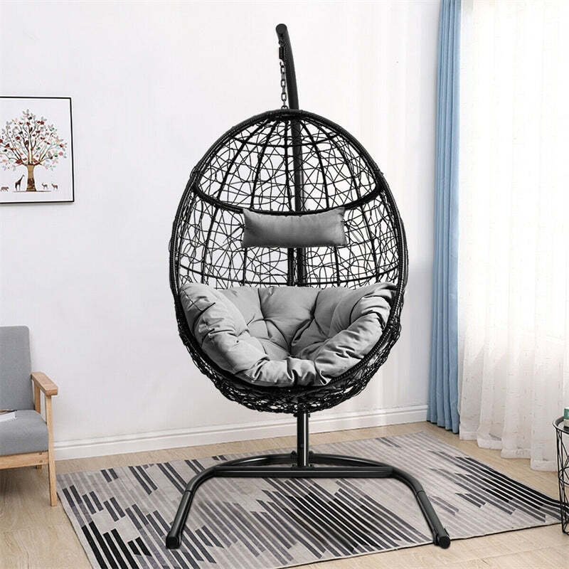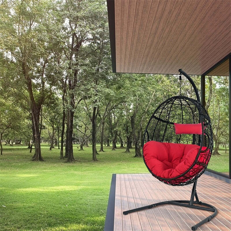 The hanging Egg hammock chair set with a hammock stand and the cushion is a perfect choice for better enjoying your outdoor leisure time. A heavy-duty metal frame with non-slip pads could always keep this egg chair stable without falling over easily. With an enhanced frame and safety hook, this swing hammock chair can hold you well and offer you an extra balance to use with more convenience. The soft fiber-filled seat cushion and headrest pillow also provide you with luxurious comfort and reduce fatigue. You can use it indoors or outdoor as you like to enjoy your leisure time.