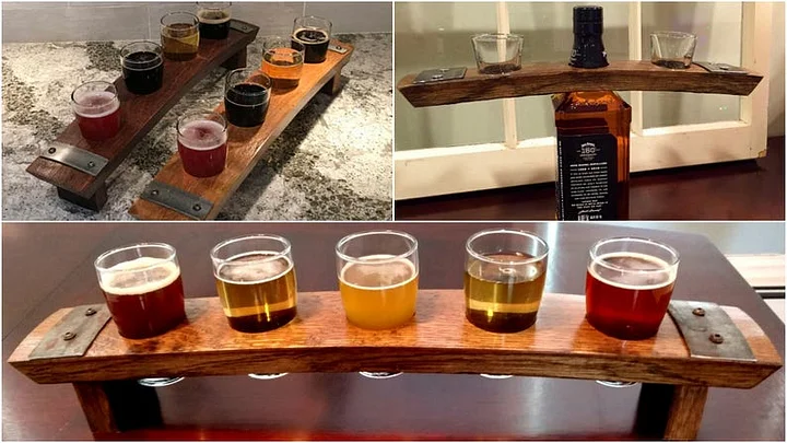 Are you looking for the perfect MANCAVE gift? Beer and Shot Glass Flight Trays made from a reclaimed whiskey barrels. We use the American Oak and steel hoops from the reclaimed barrels to create a unique, rustic, yet classical pieces to serve taste flights of your favorite beers and liquors. Includes 5oz. beer tasting glasses or 1.5oz shot glasses depending on your choice.