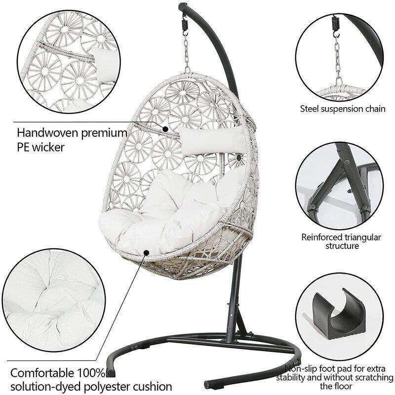 We are proud to present this classically designed swing for you. Beautiful patterns woven from high-quality wicker give this hammock swing chair an eye-catching look, classic colors blend well with a variety of decorative styles, and ergonomic cushion and headrest pillow provide you the ultimate comfort. In particular, this egg hanging chair suitable for both indoor and outdoor use. It is undoubtedly a good choice to sit on it for a nap or enjoy the breeze on the balcony or patio.