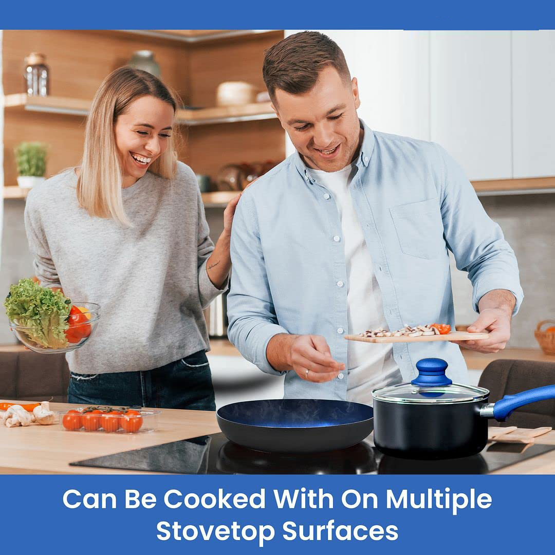 - Useable across gas, electric and induction stove tops. This cookware set can be cooked with on multiple stovetop surfaces and are dishwasher safe. Great gift for foodies