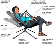 This first-ever swinging and reclining camp chair takes relaxation to a new level. The swinging offers an exciting new sitting experience, with a relaxing motion that is designed for comfort. And when you’re ready to recline, lean back and enjoy a great view of the stars. Unlike rocking chairs, this chair is designed for use on any surface, including rocky, sandy or uneven ground, bringing the relaxation of motion to a host of new environments.