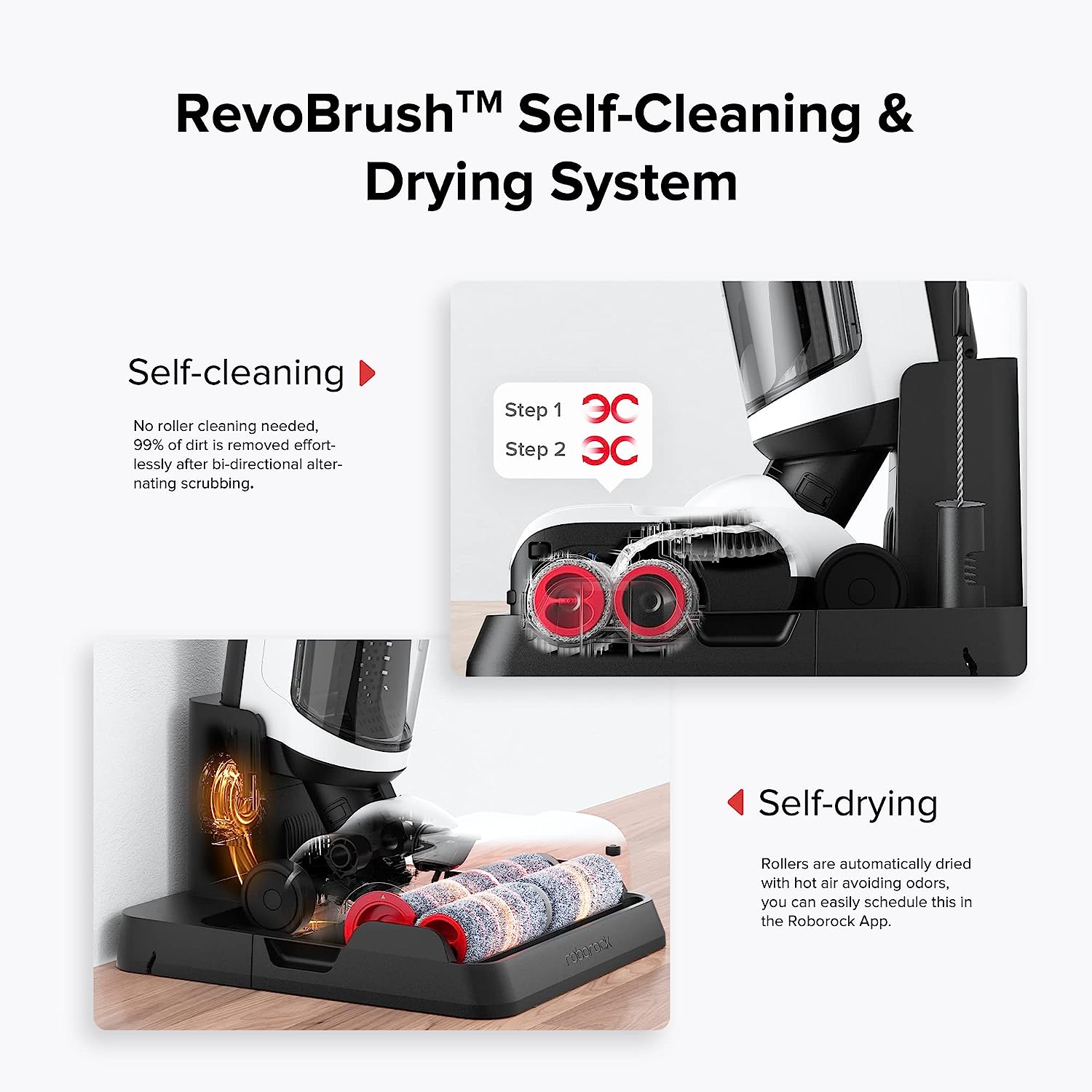 - RevoBrush Self-Cleaning. Automatically transform your rollers from dirty to clean, while you clean your floors, your brushes clean themselves. Dirt is removed from the rollers due to the alternating scrubbing.