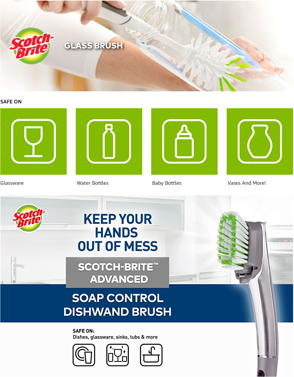 • Scotch-Brite Kitchen Brush Kit - Glass and Water Bottle Brush & Advanced Soap Control Dishwand Brush - Scrub Brushes for Cleaning Kitchen and Washing Dishes