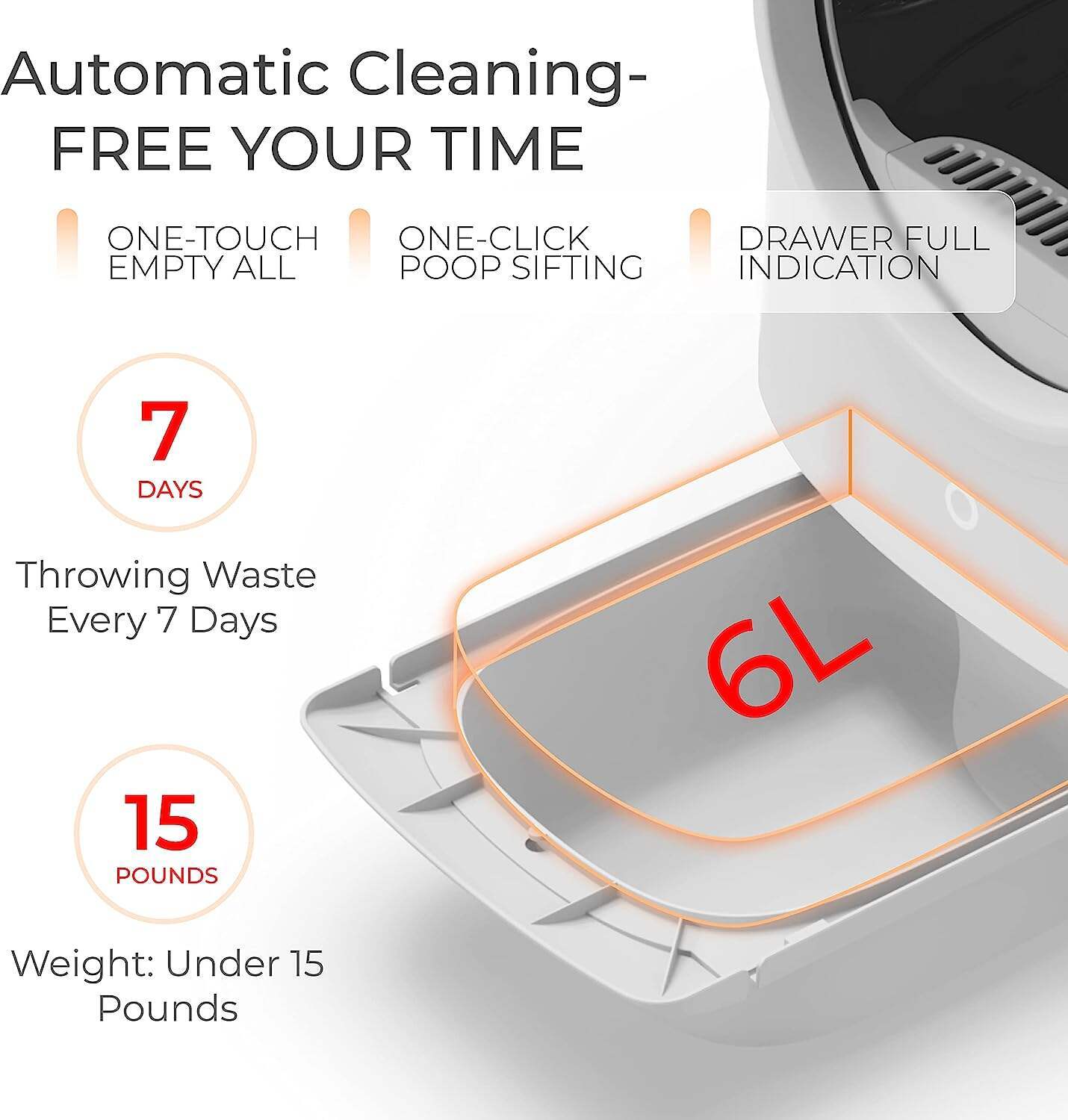 • AUTOMATIC CLEANING: Automatically clean up the excrement after the cat has finished defecating, automatically detect when the cat has left the safety and set the delayed cleaning time by APP. The excrement is separated from the clean cat litter in the litter box, just replace the litter bag when it is full.