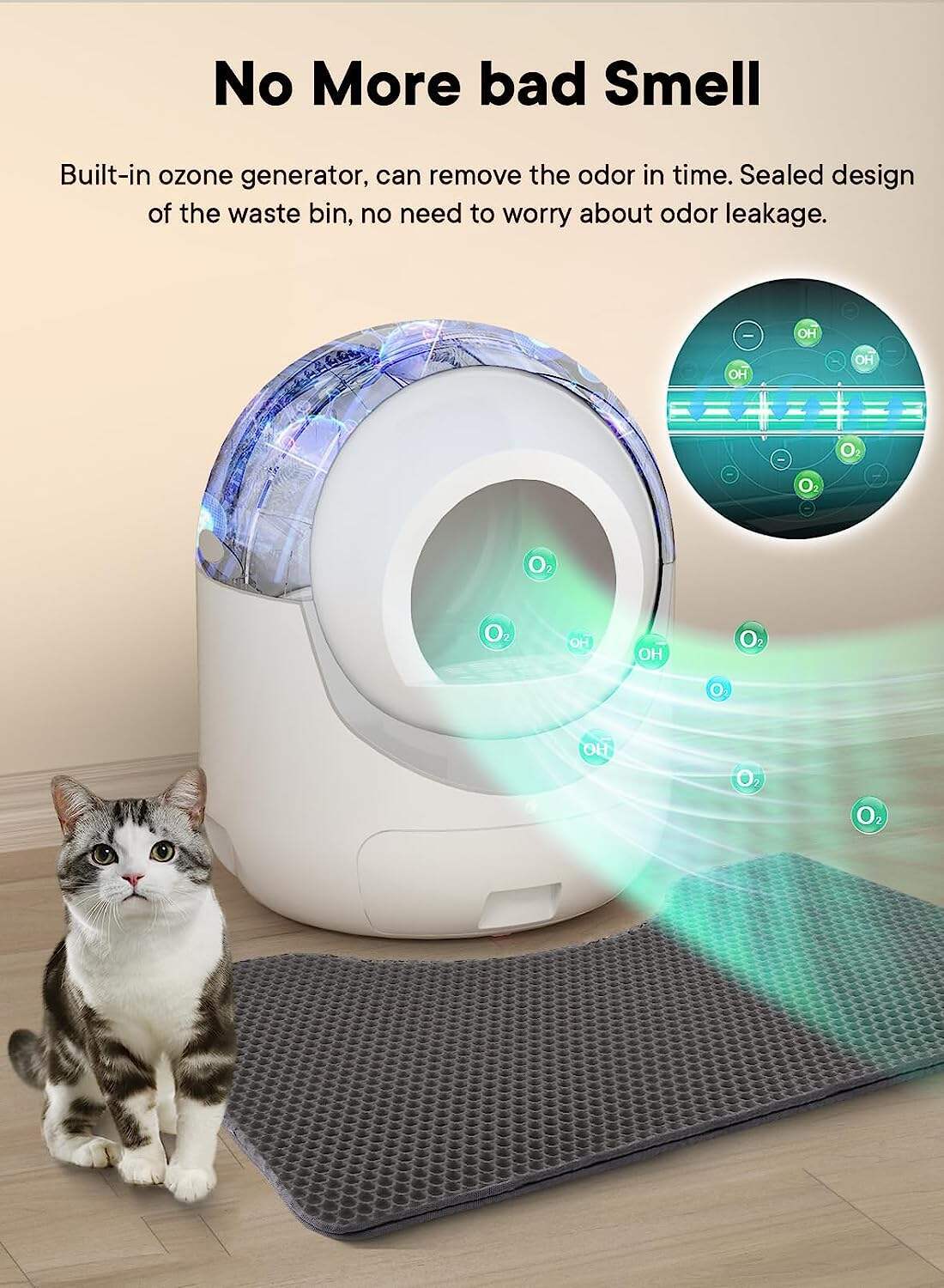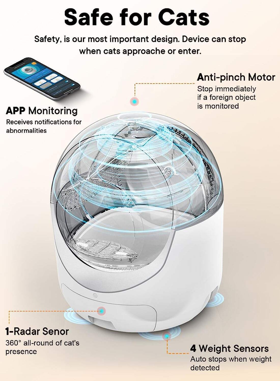 - Safe for Cats: Self Cleaning Cat Litter Box, equipped with 8 highly sensitive gravity sensors and an anti-pinch motor. It will not work when there are cats inside or nearby. When there is an abnormality in the work, Self Cleaning Cat Litter Box will stop immediately to ensure safety